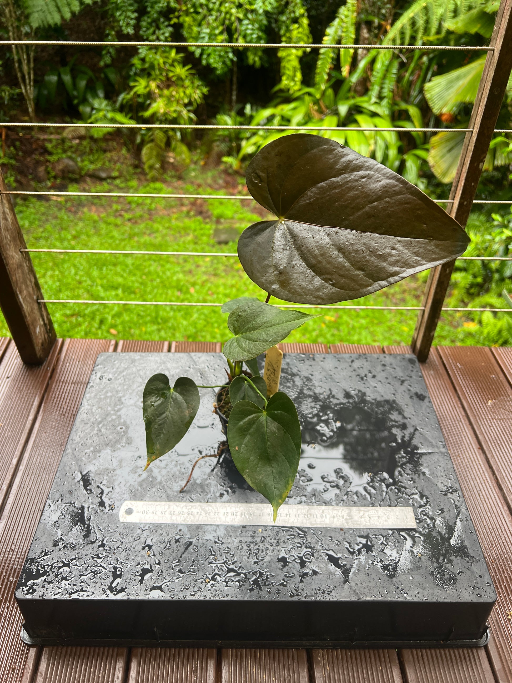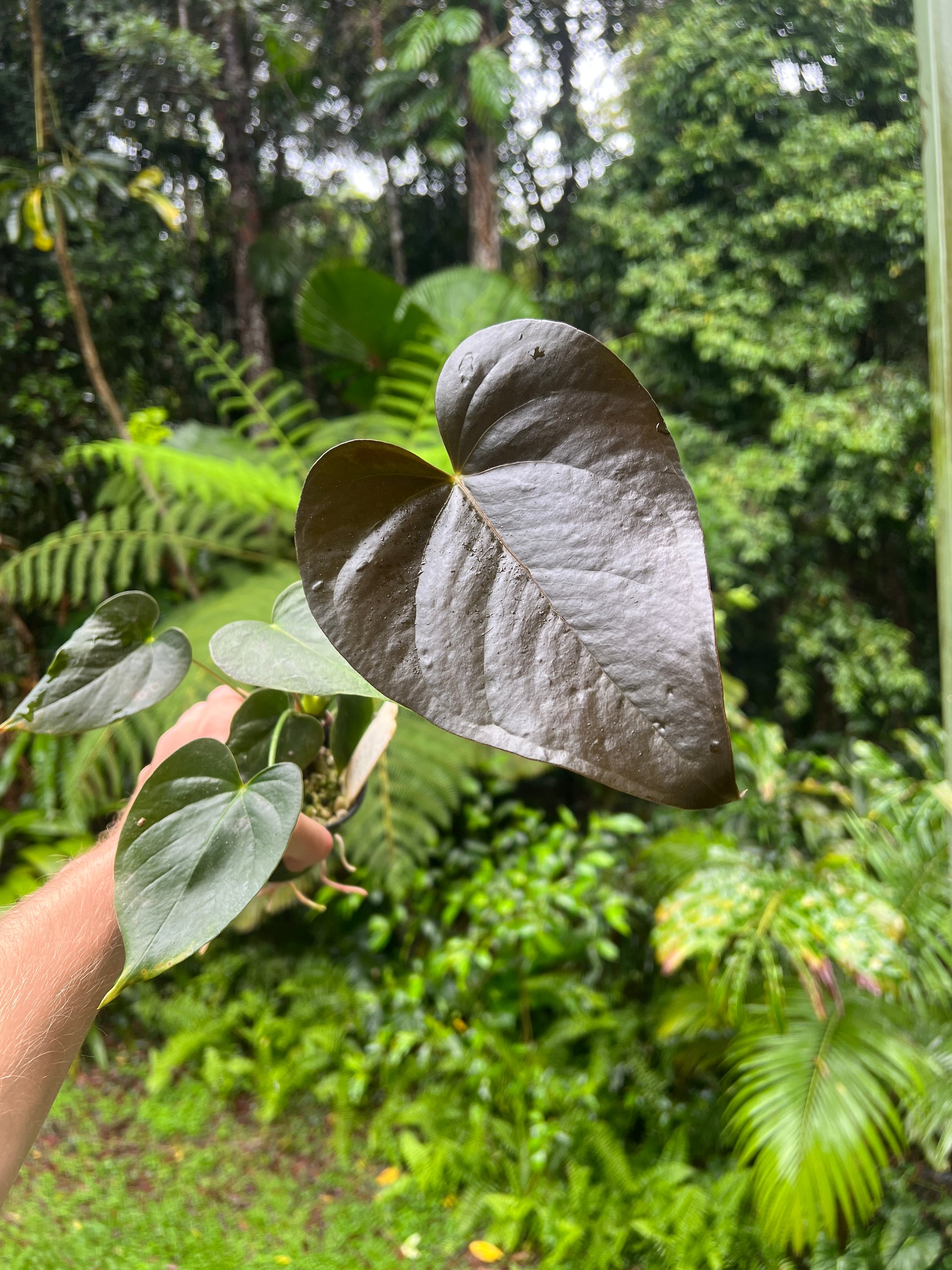 Dark and Glossy hybrid very black new leaves, likely a hybrid of moody and andreanum type. Old clone originally from Cairns Botanic Gardens. Grown from cutting