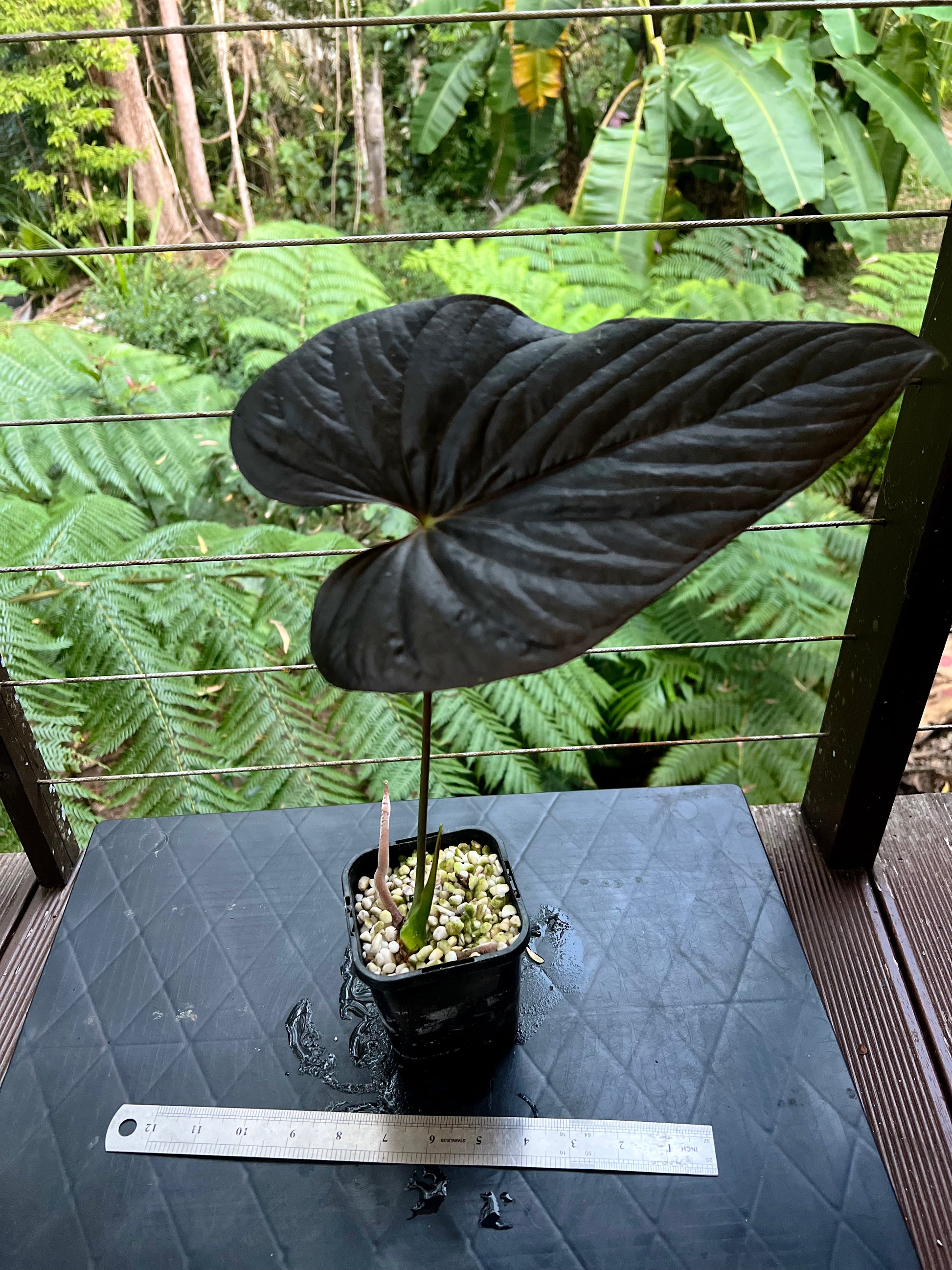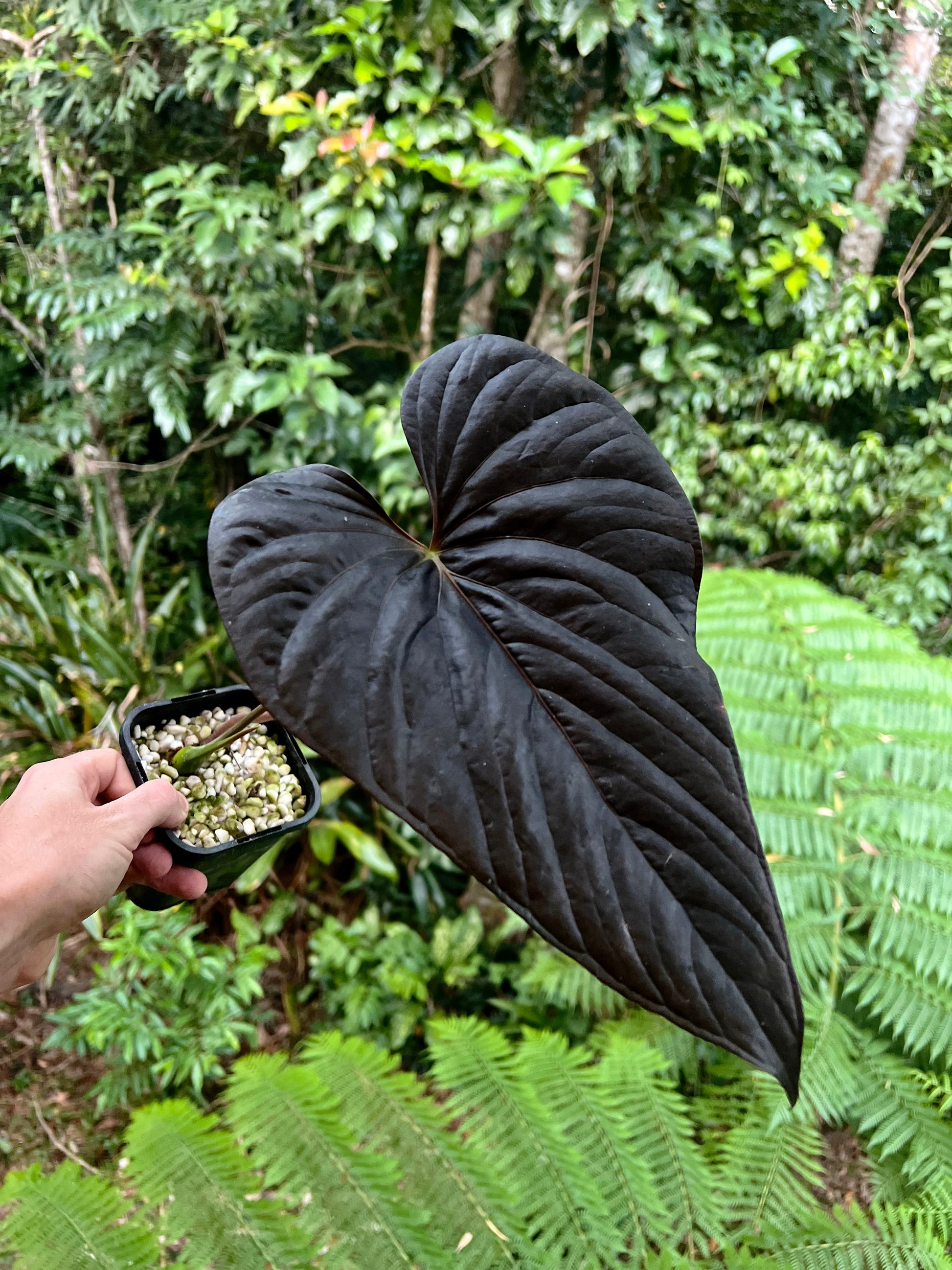 Cutting grown from big stem cutting has two germinated shoots. This is a clone of our Moody it's the same as what people call moodeanum in the US currently. It was renamed to Red Beauty based on the thought it was spread from an old batch of tissue culture of Red Beauty but that plant actually looks different according to SKG that distributed a lot of Reb Beauty tissue culture at the time. Anthurium moodeanum is not currently an accepted species