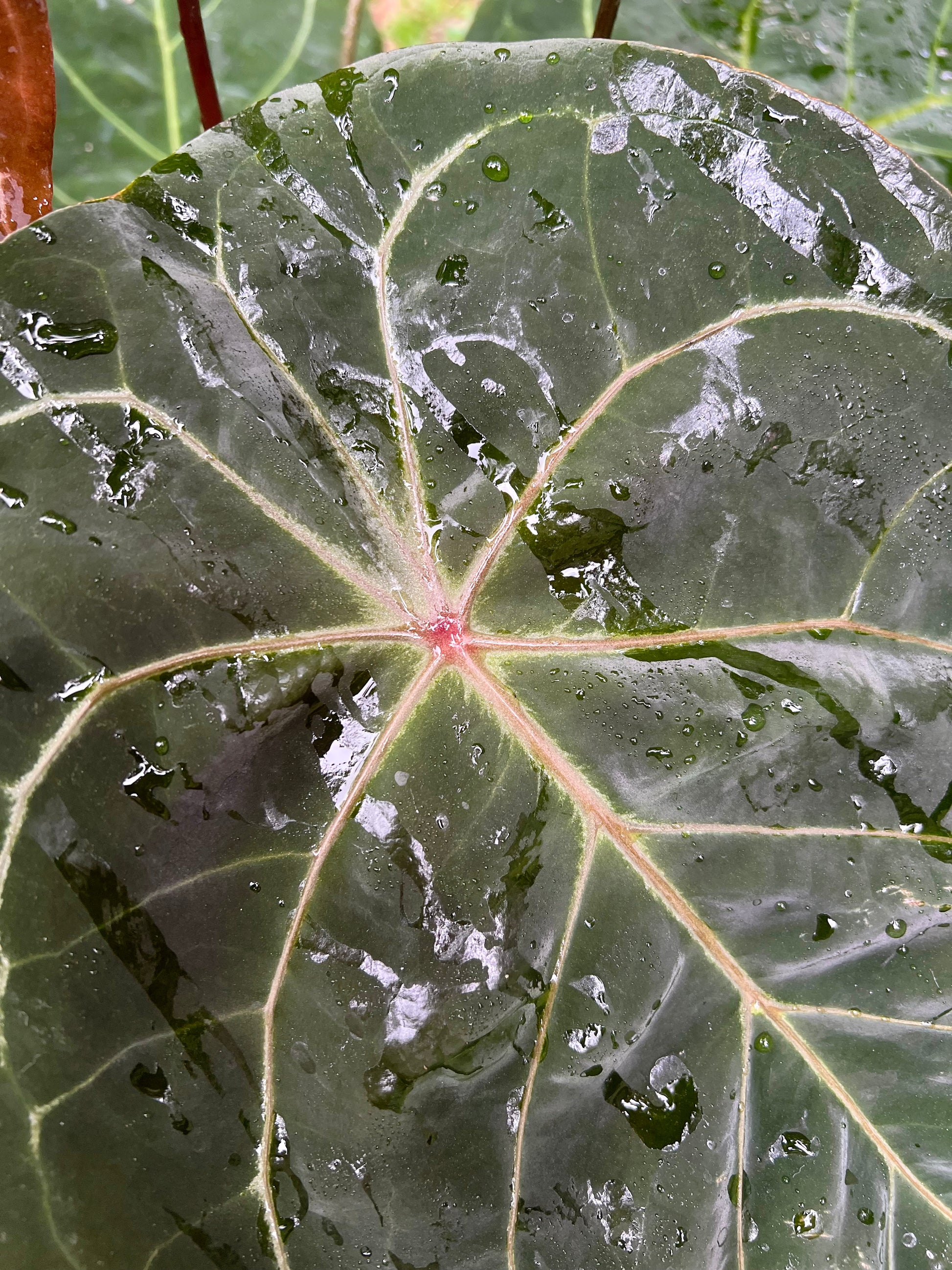 Breeding Goals - Looking for offspring that maintain the peltate leaf shape and purple colour in the primary vein junction like in the seed parent. Hoping the rest of the vein structure can become less noticeable - resembling the pollen parent, also adopting the compact nature of kunayalense would be nice!