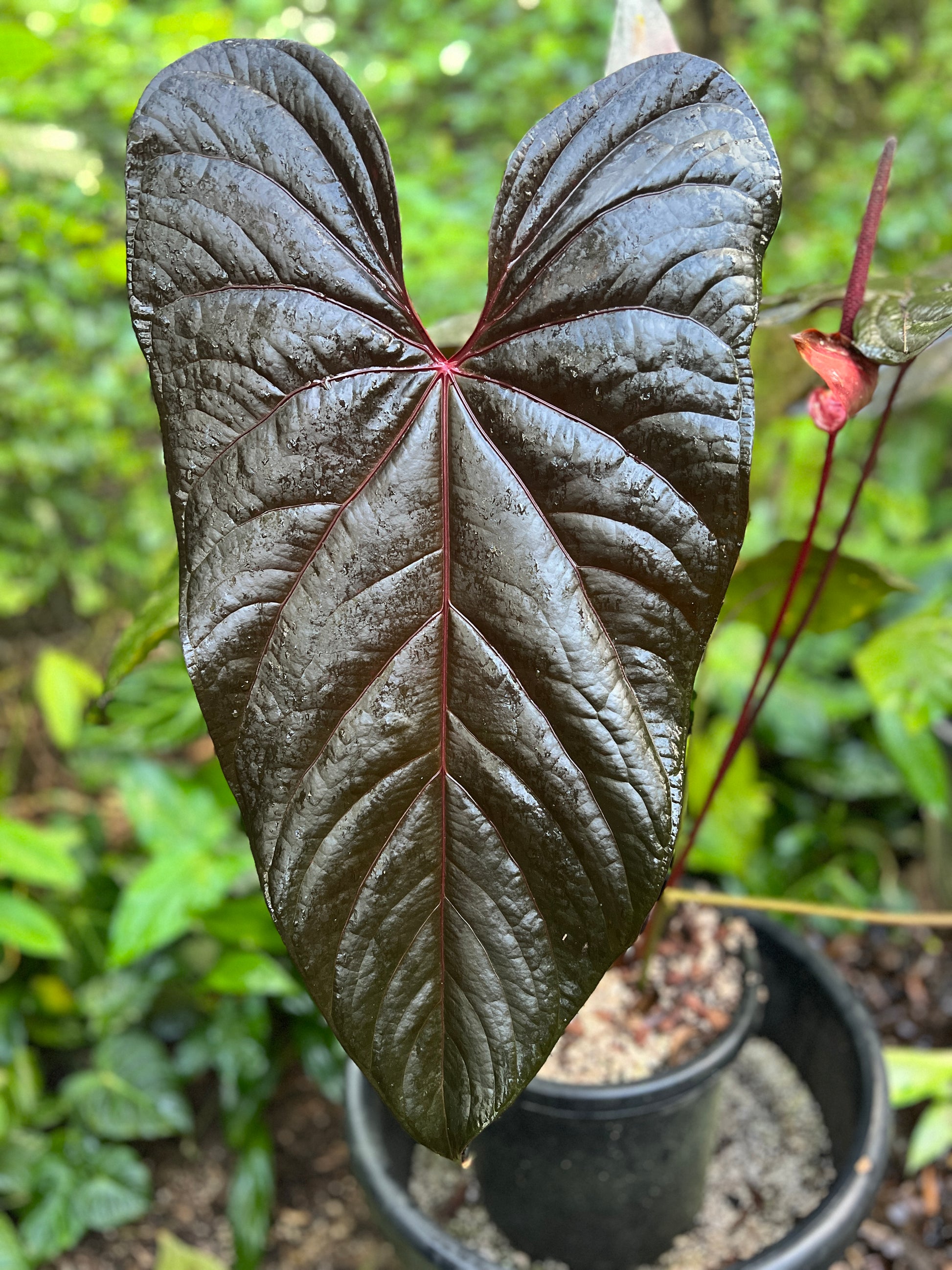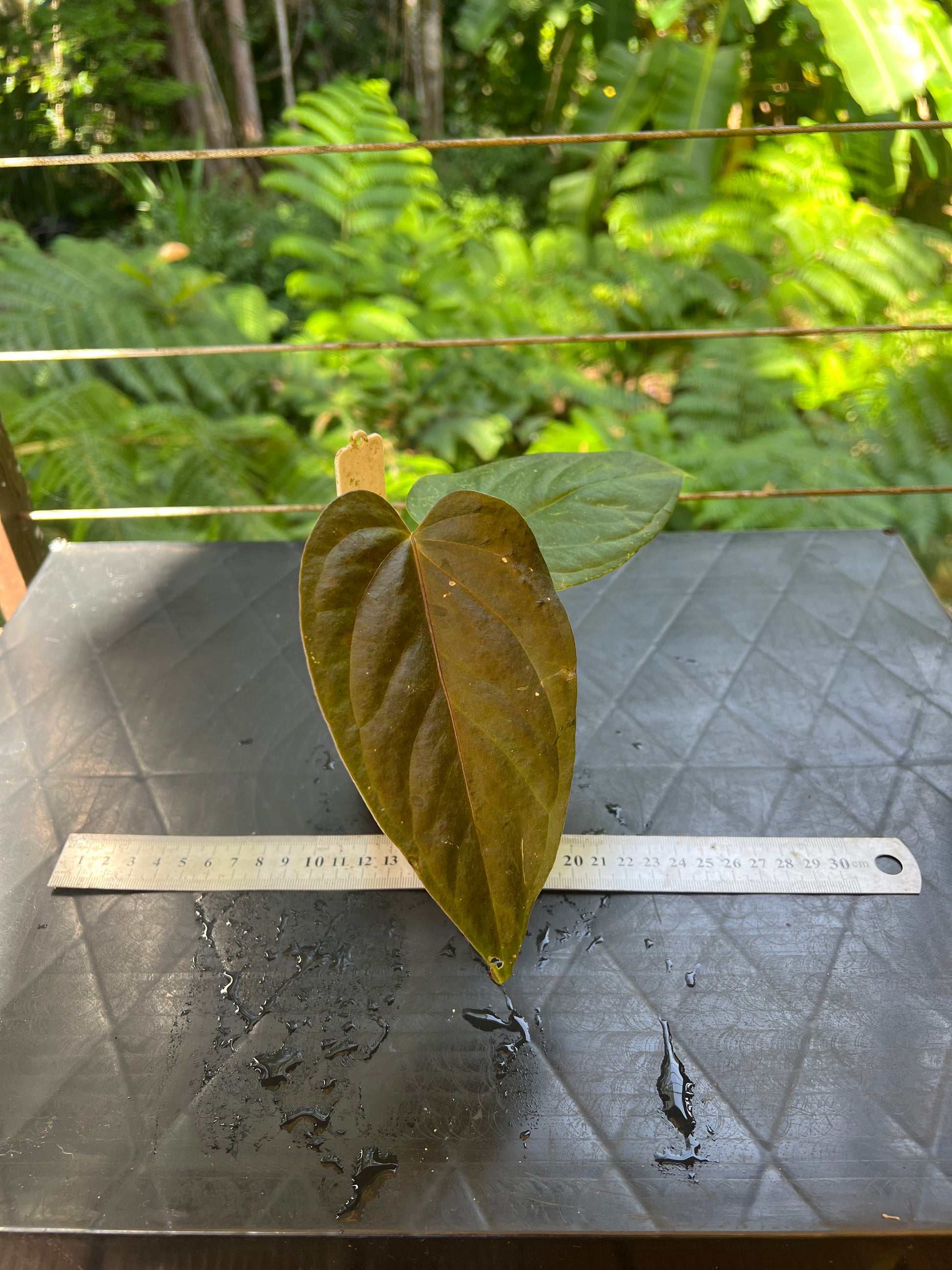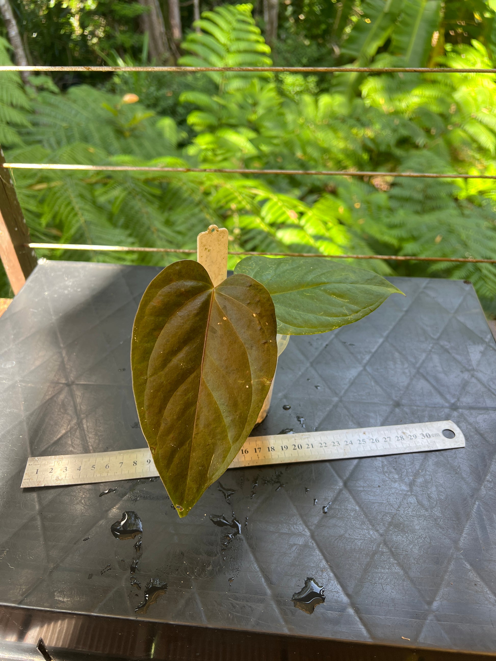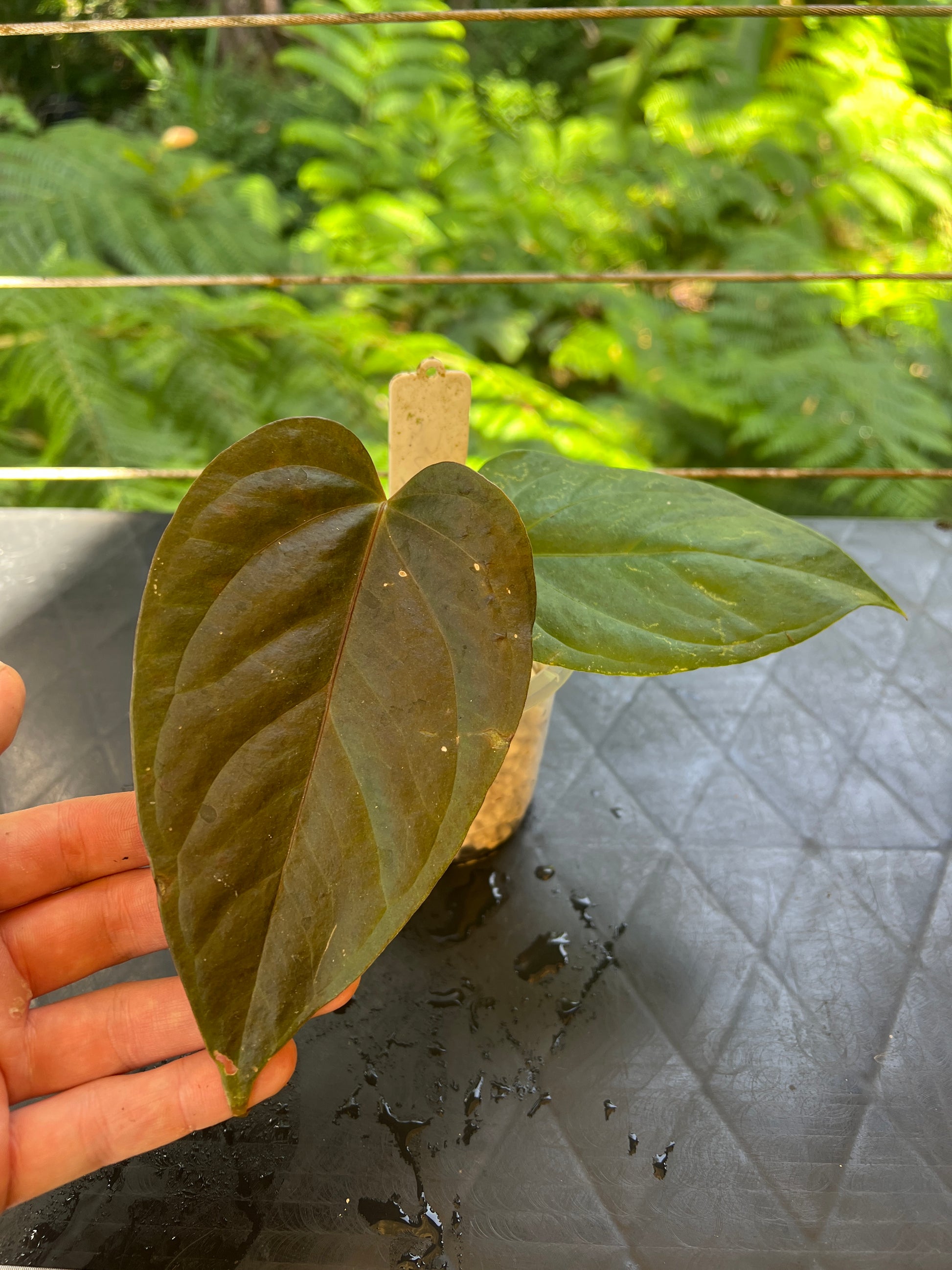 Sang x moody ‘metalic’ this one has a quite metallic grey leaf, veins come out red turning to a nice purple maroon as the leaf hardens, can hold 3-4 nice darker coloured leaves. This is a rooted little prop from the plant shown. It can be pollinated with velvet types successfully with small yields (semi-fertile).