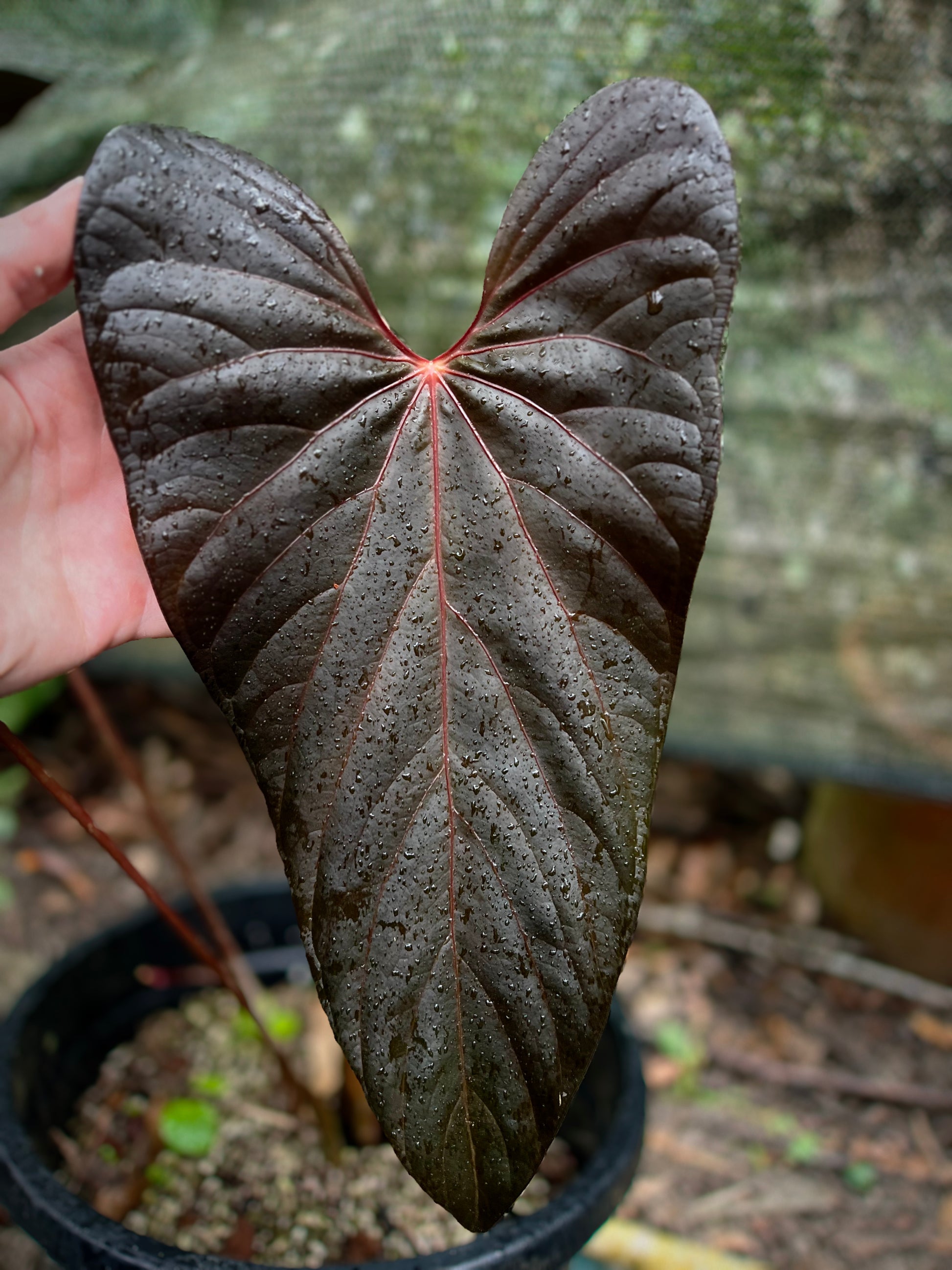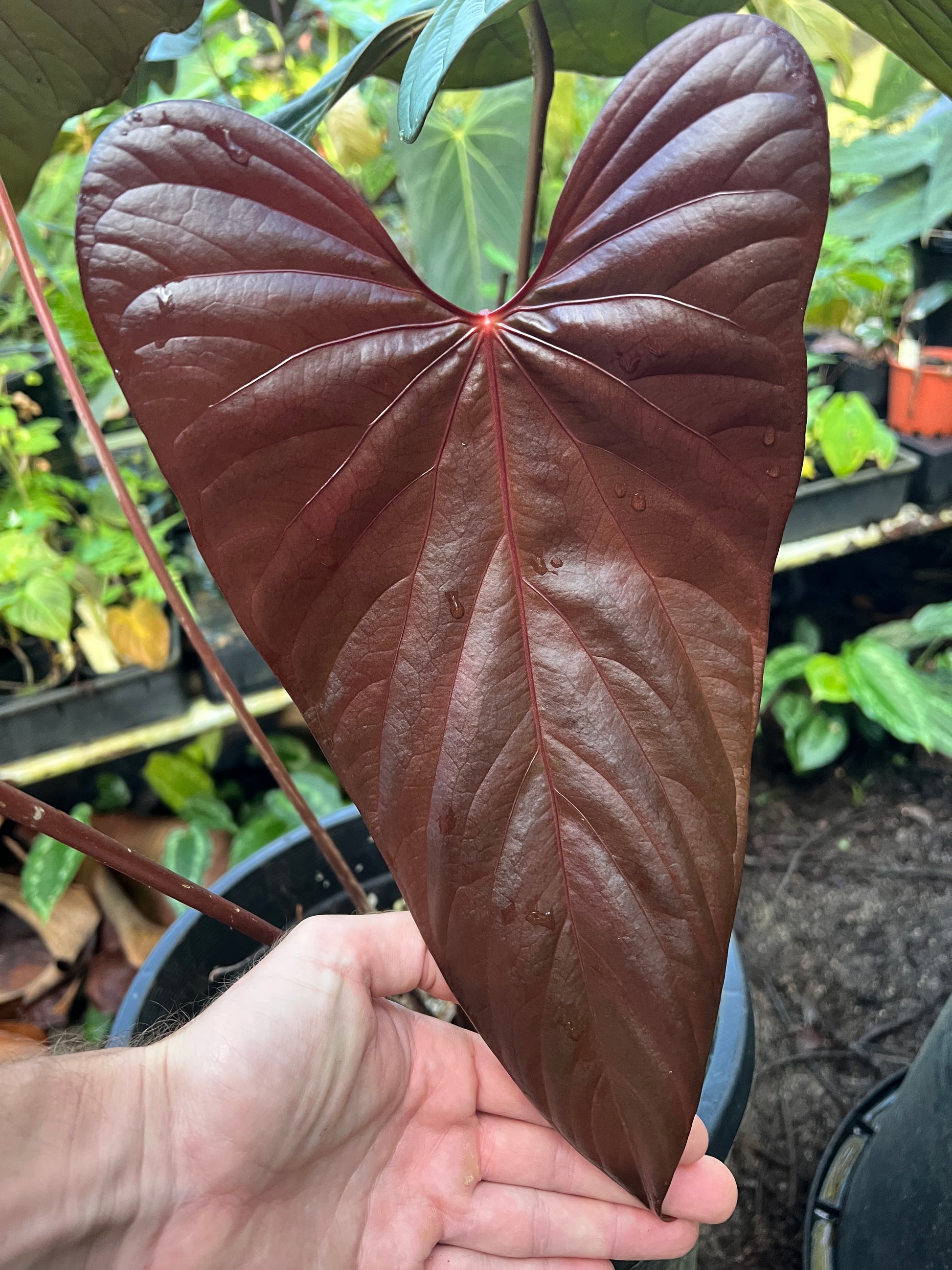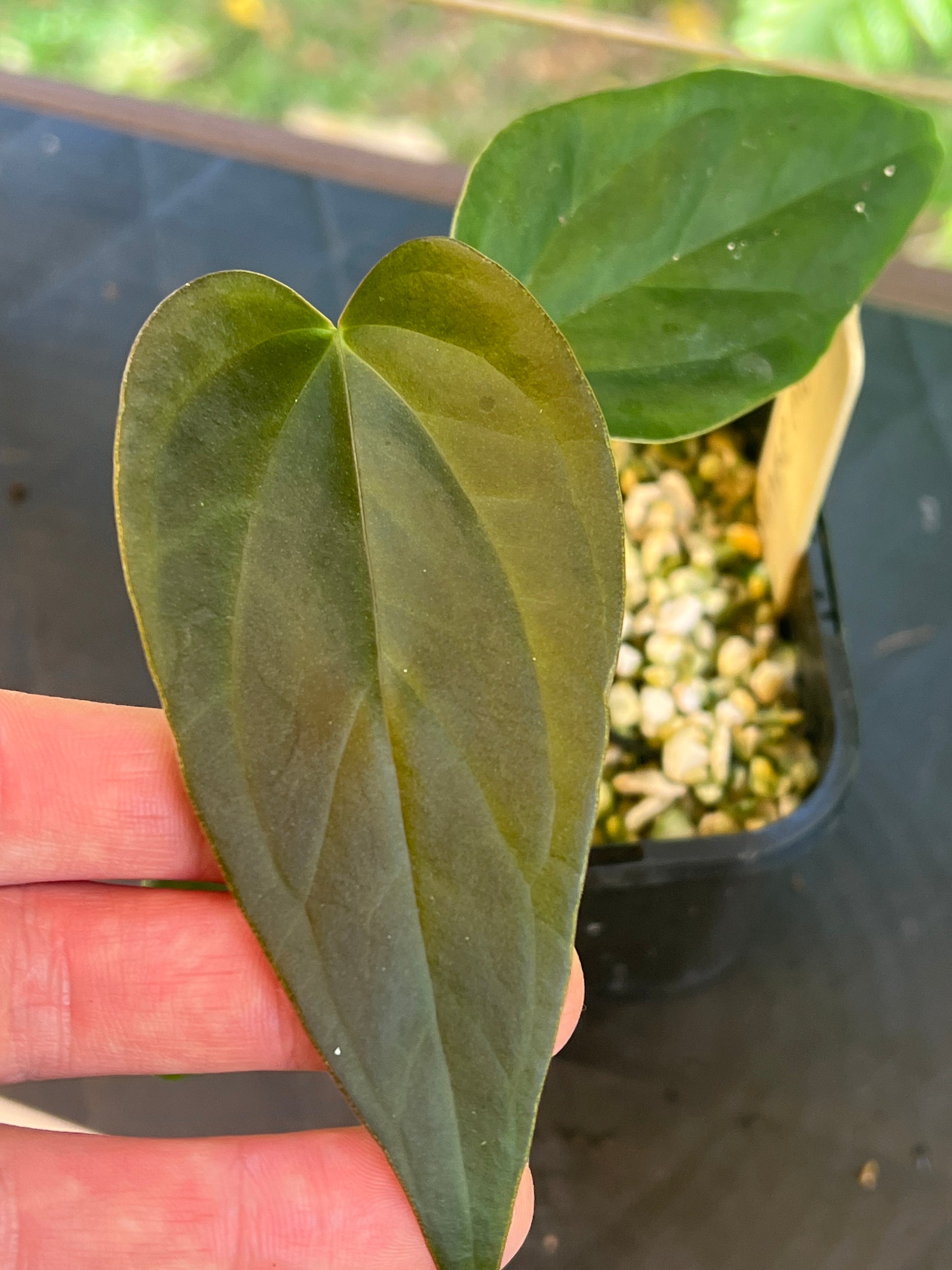 This is a clone from another of our sang x moody selections this one is more narrow, elongated with a sharp tip. I think this would pair well hybridised in the future with a narrow velvet hybrid. Veins and new leaf are red.