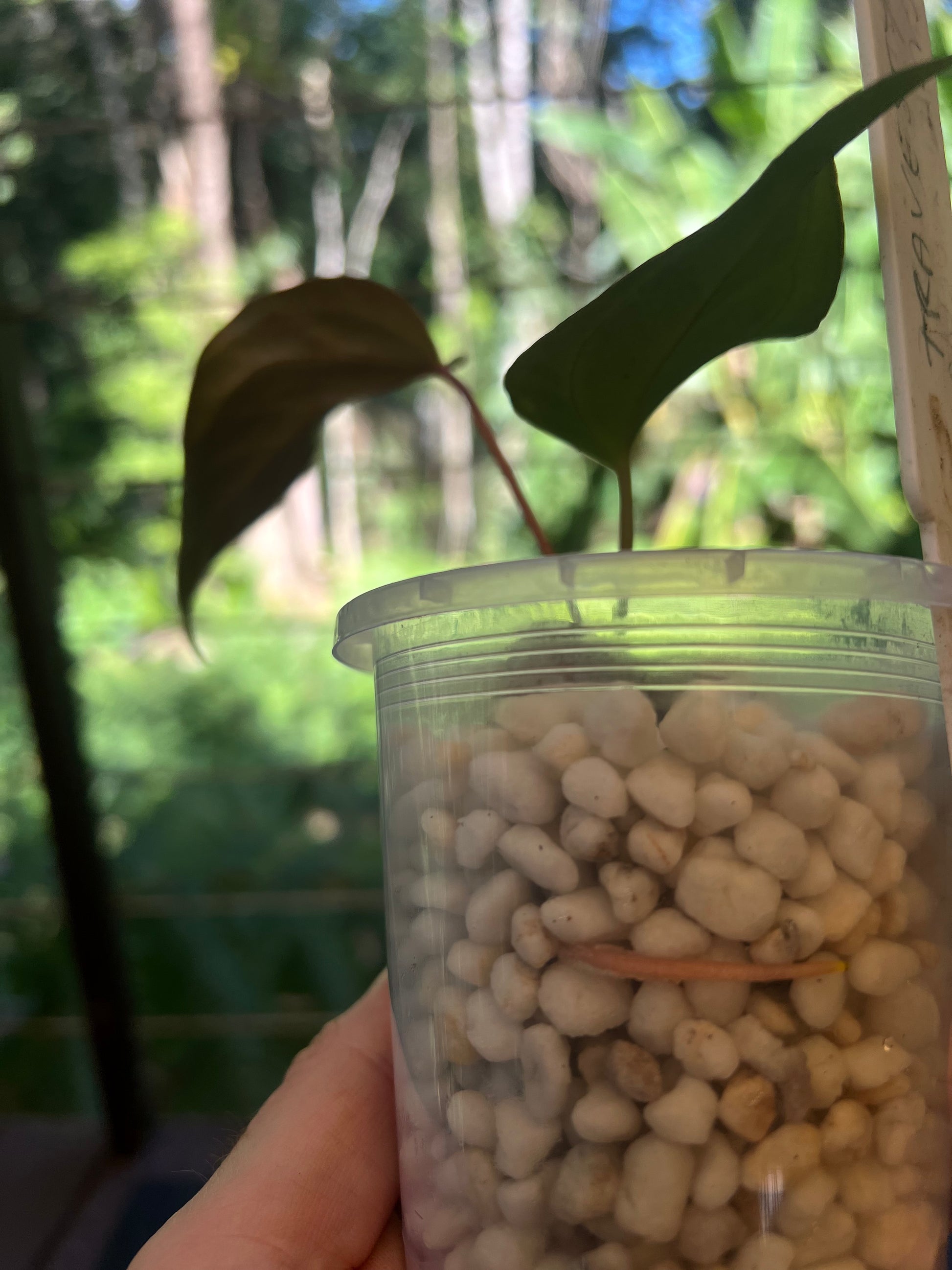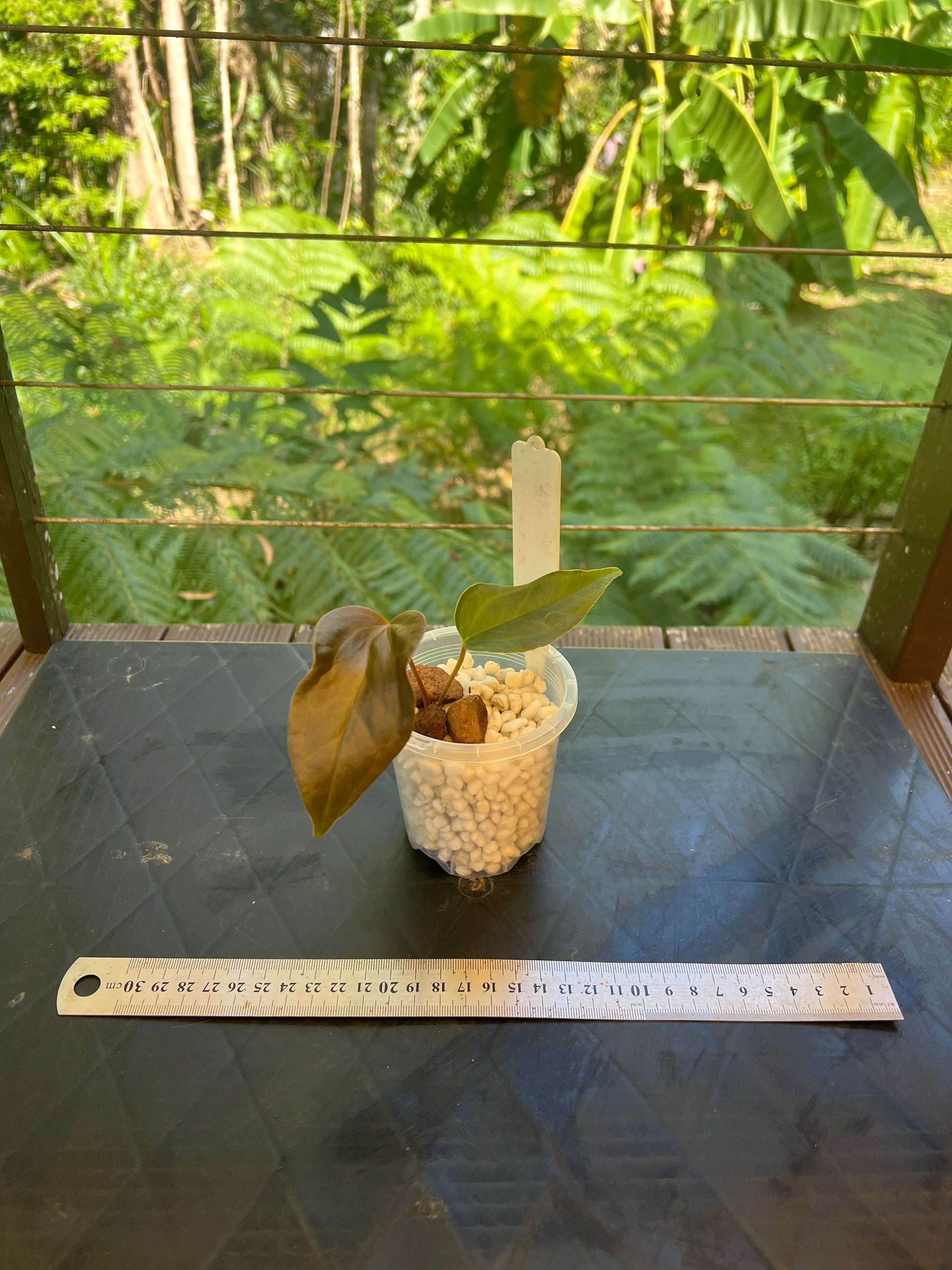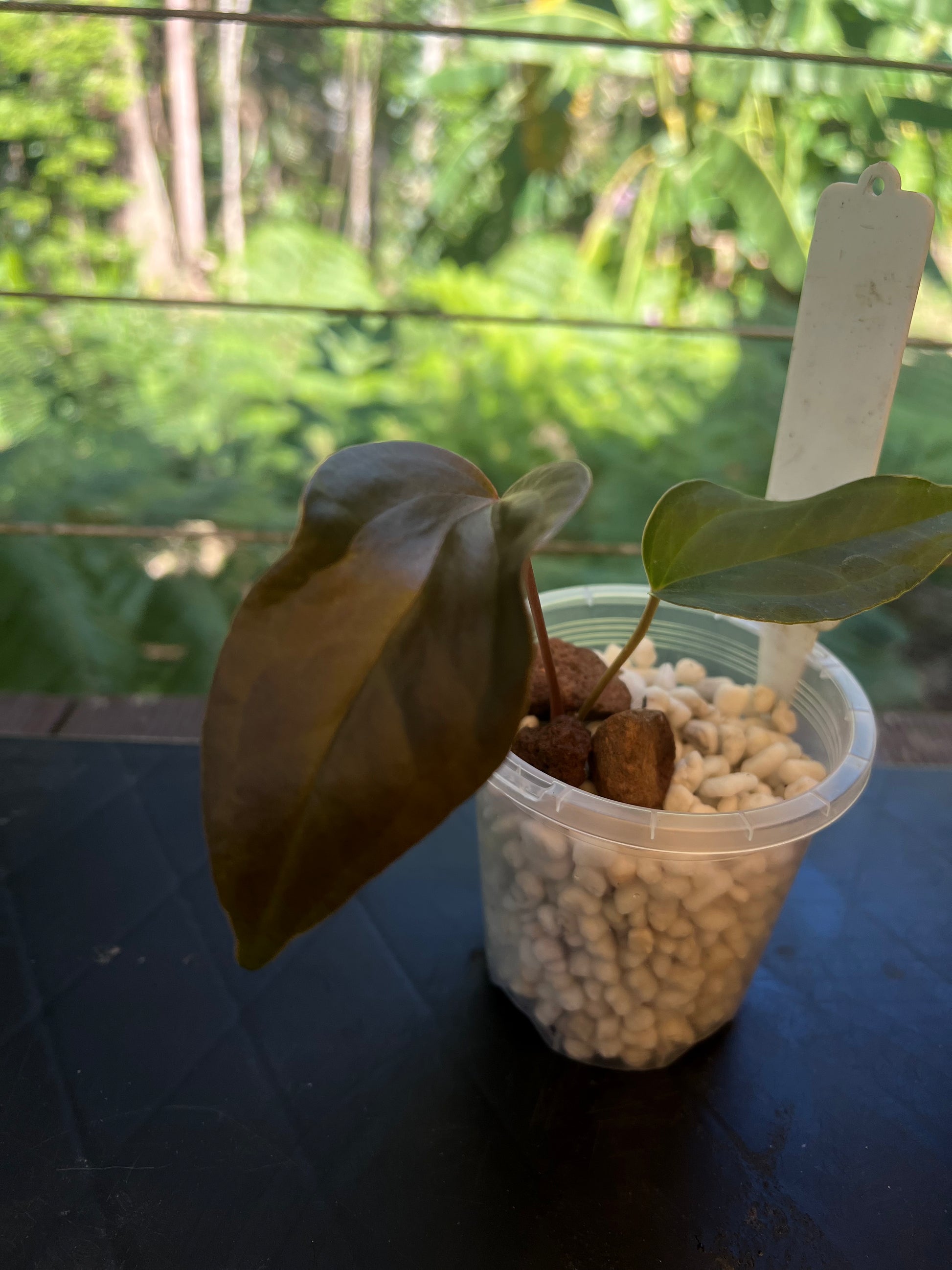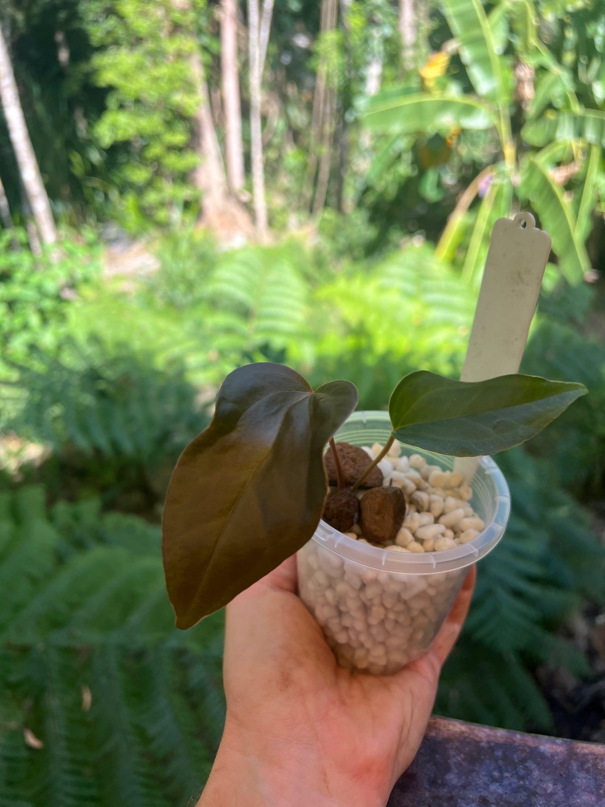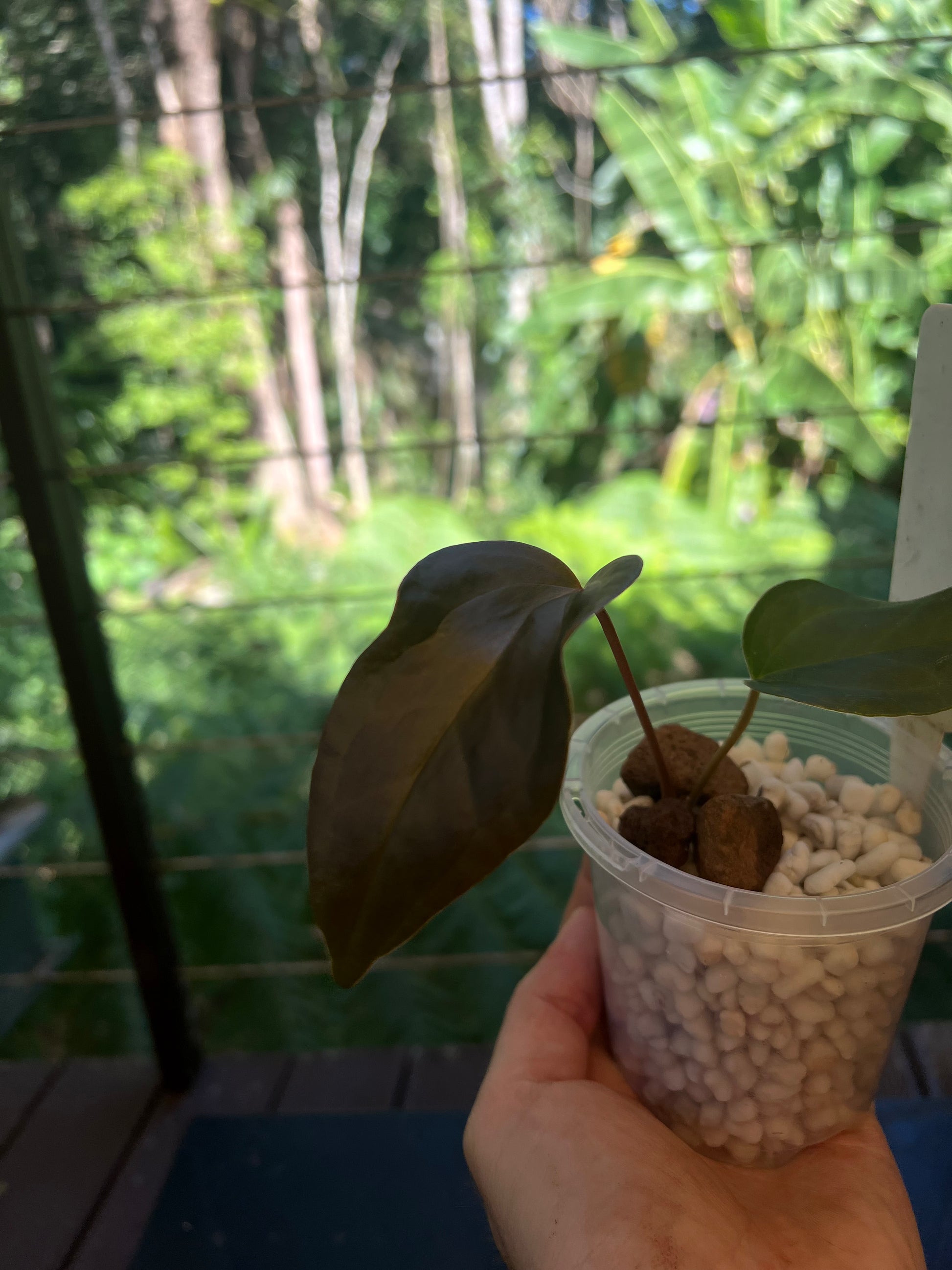 This is a select clone with very dark wavy elongated leaves, interesting texture, large pink spathe that presents above foliage. Lightly rooted, happy to hold for a little bit until it grows some more.