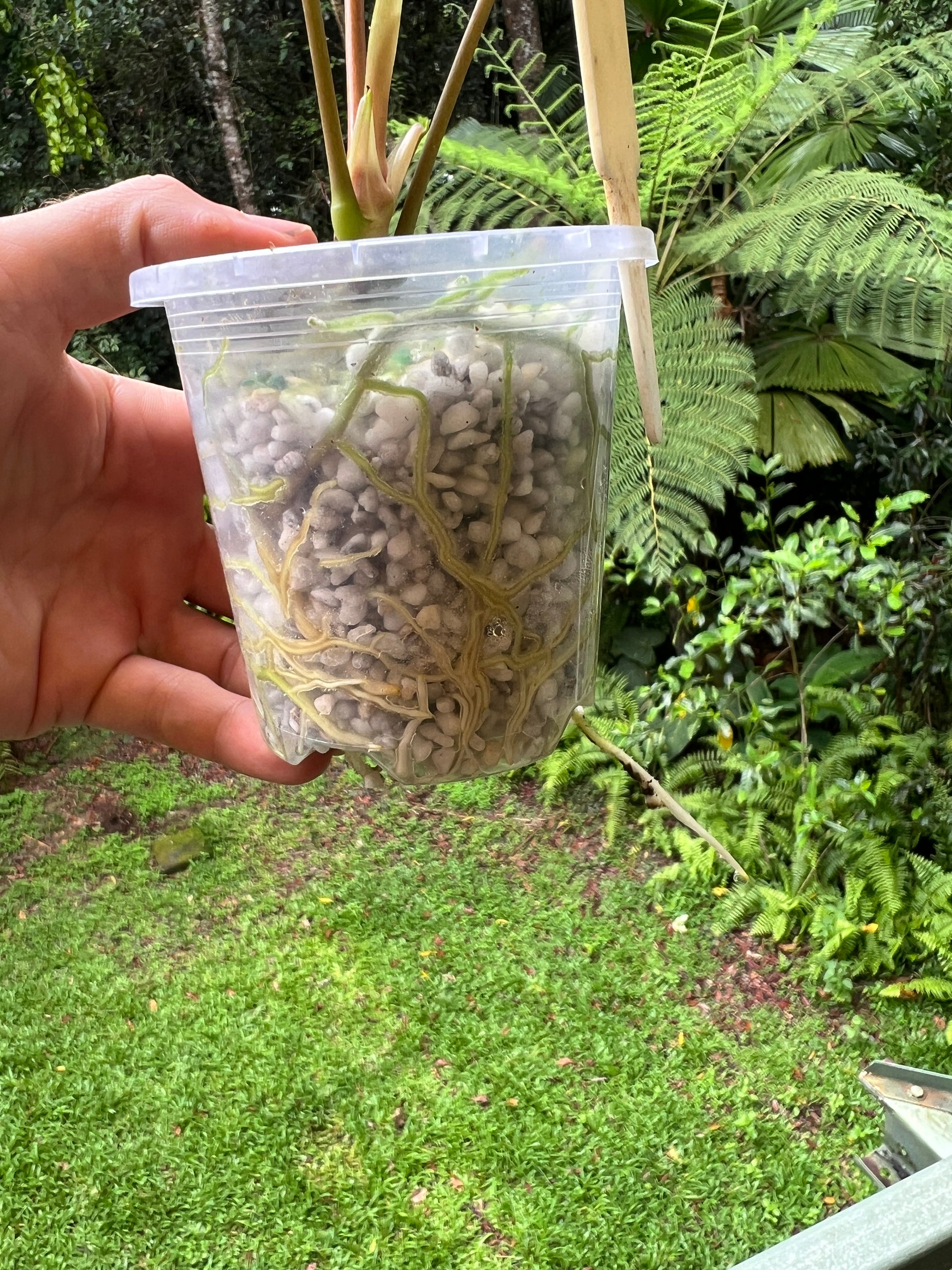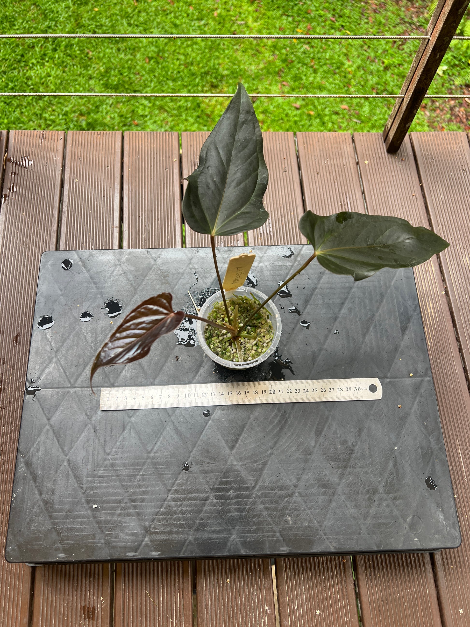 This is a select clone with very dark wavy elongated leaves, interesting texture, large pink spathe that presents above foliage. Very well rooted clonal prop.
