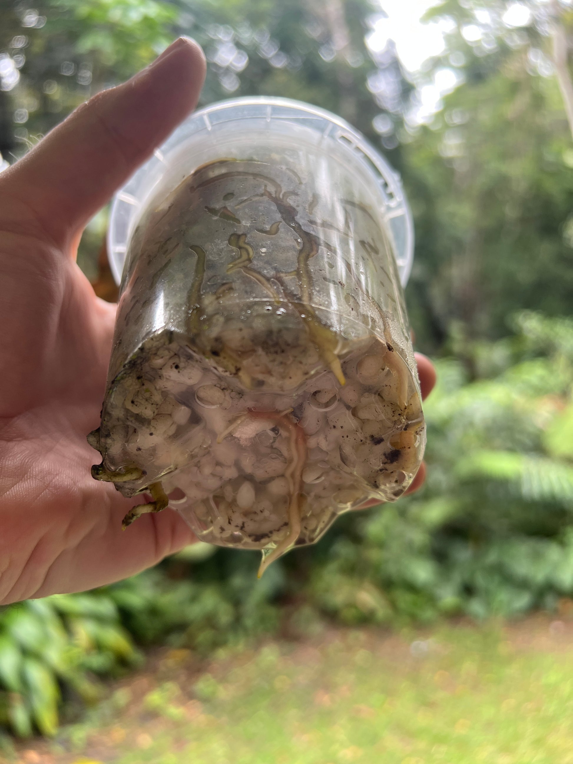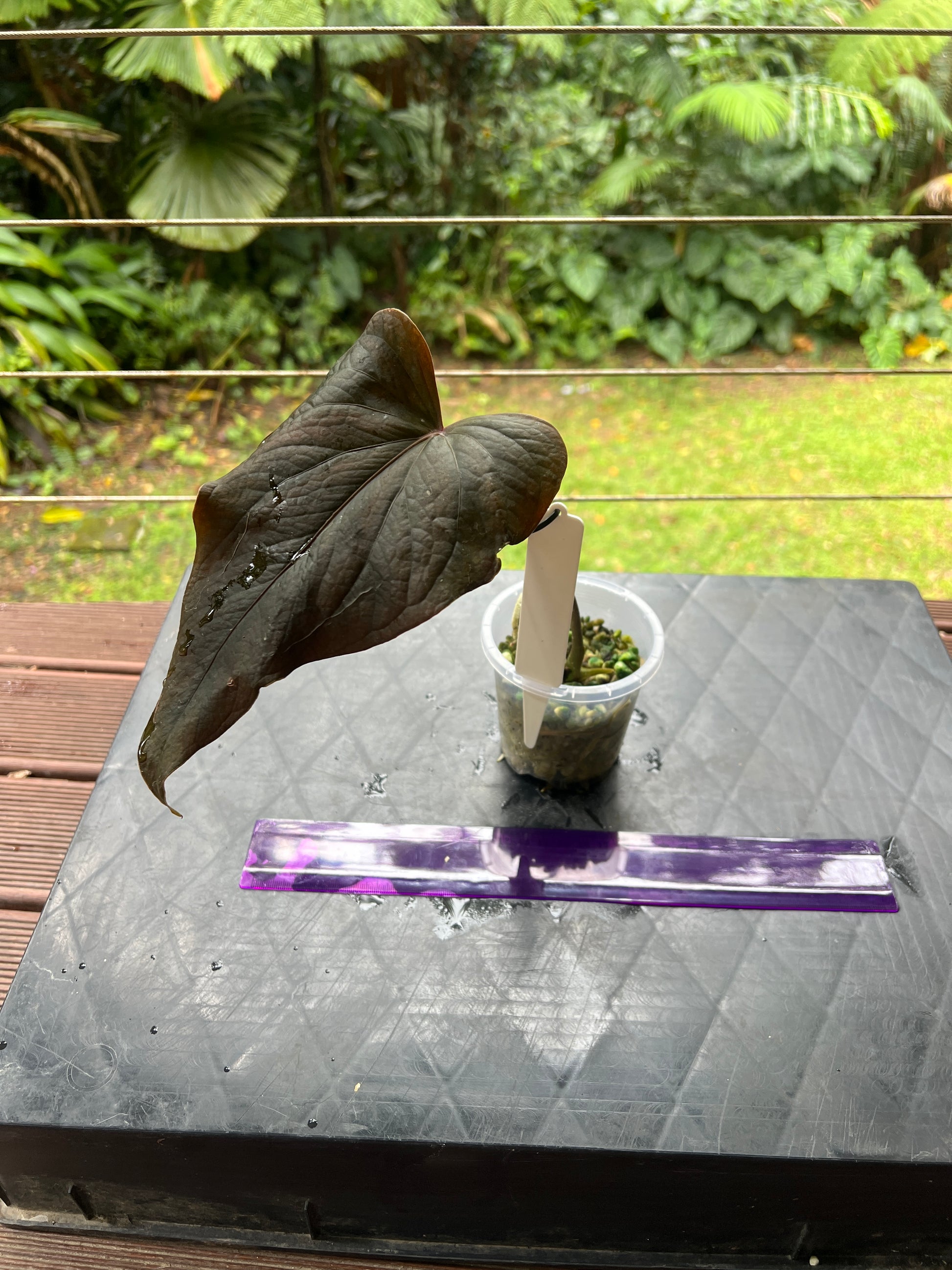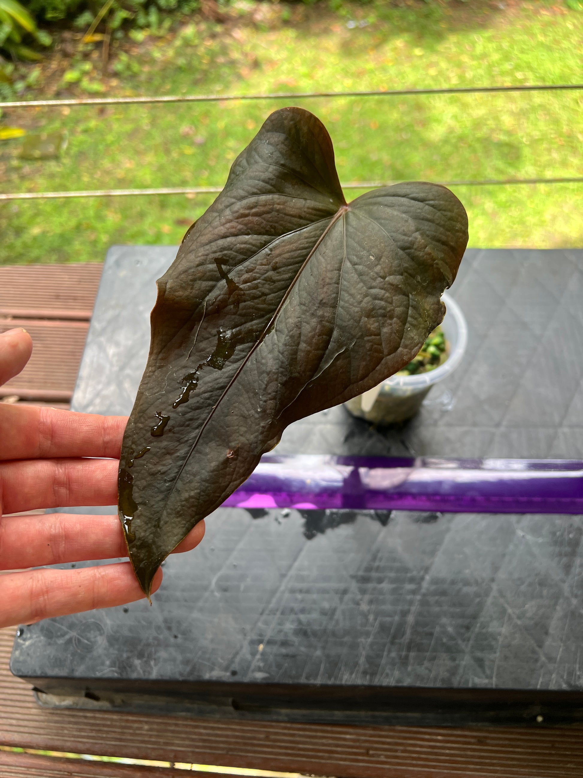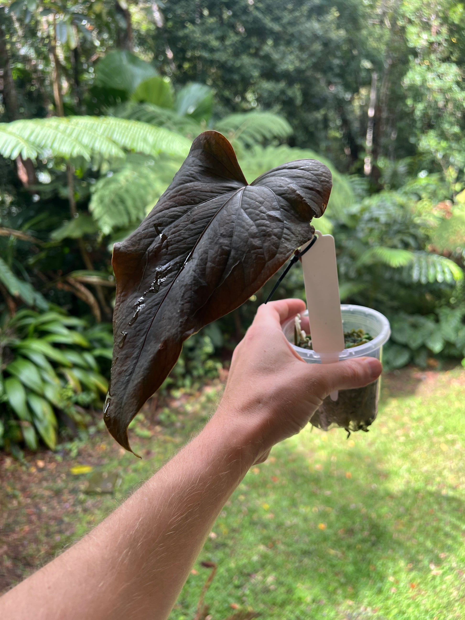 This is a select clone with very dark wavy elongated leaves, interesting texture, large pink spathe that presents above foliage. Lightly rooted, happy to hold for a little bit until it grows some more.