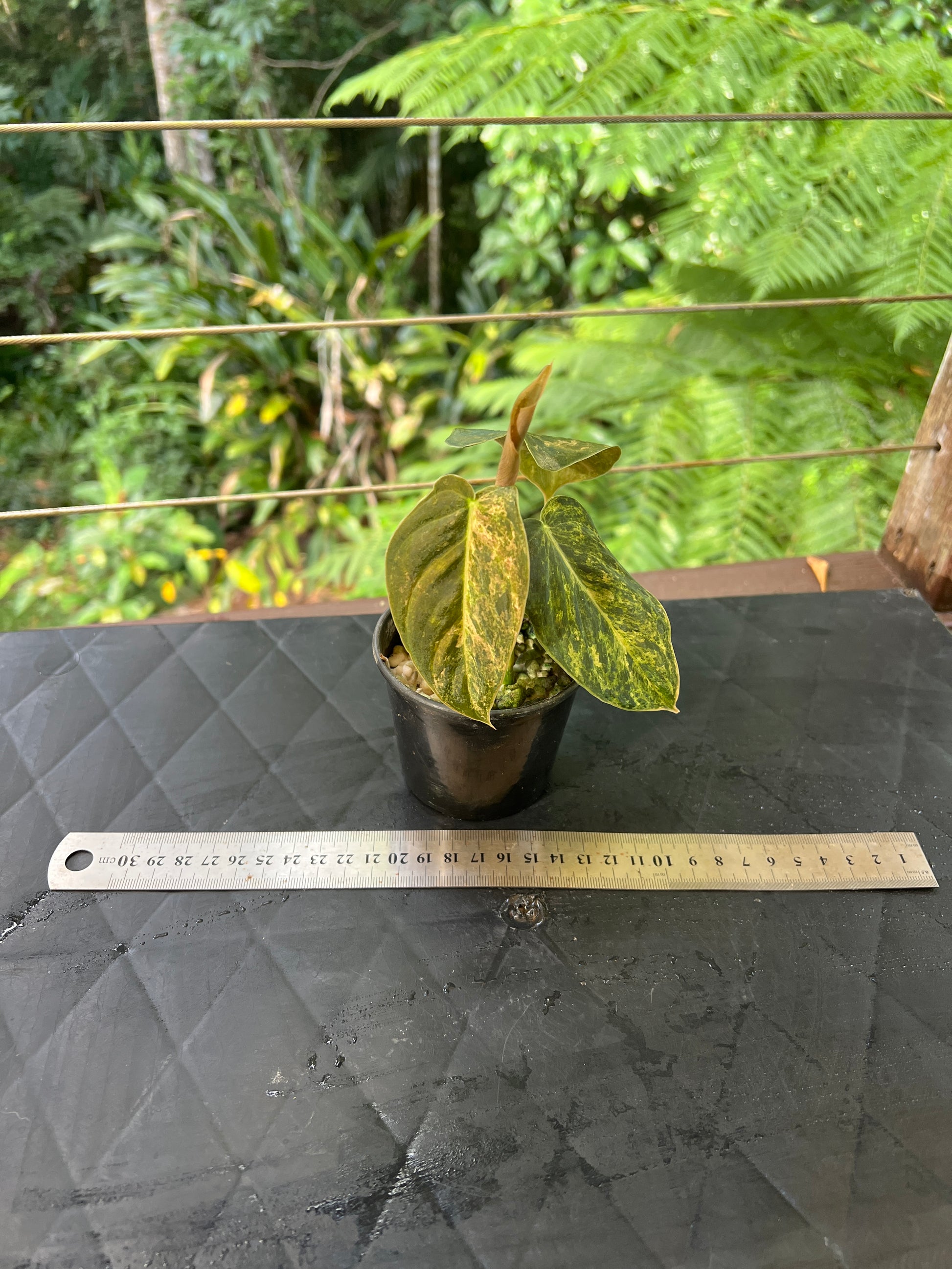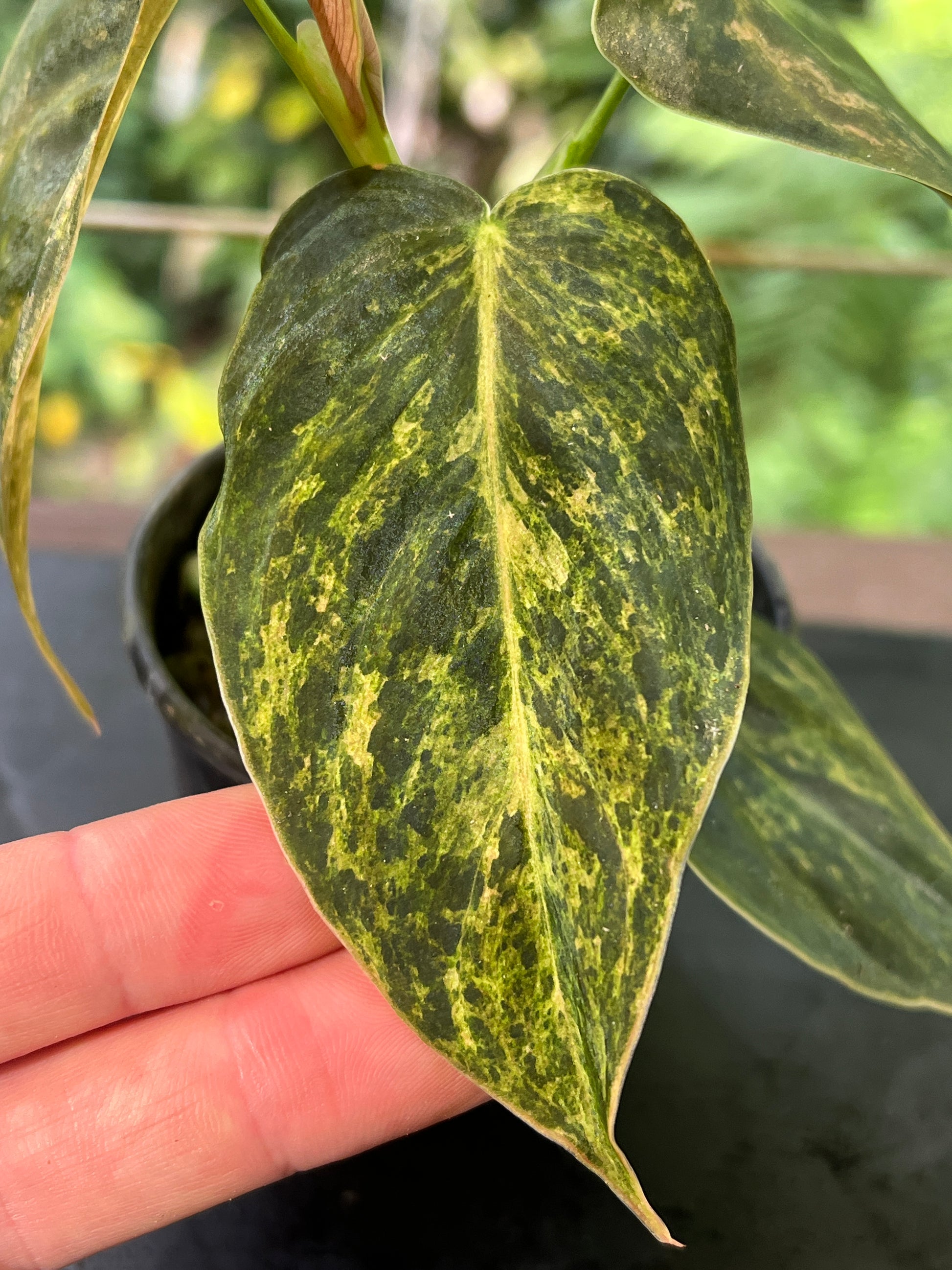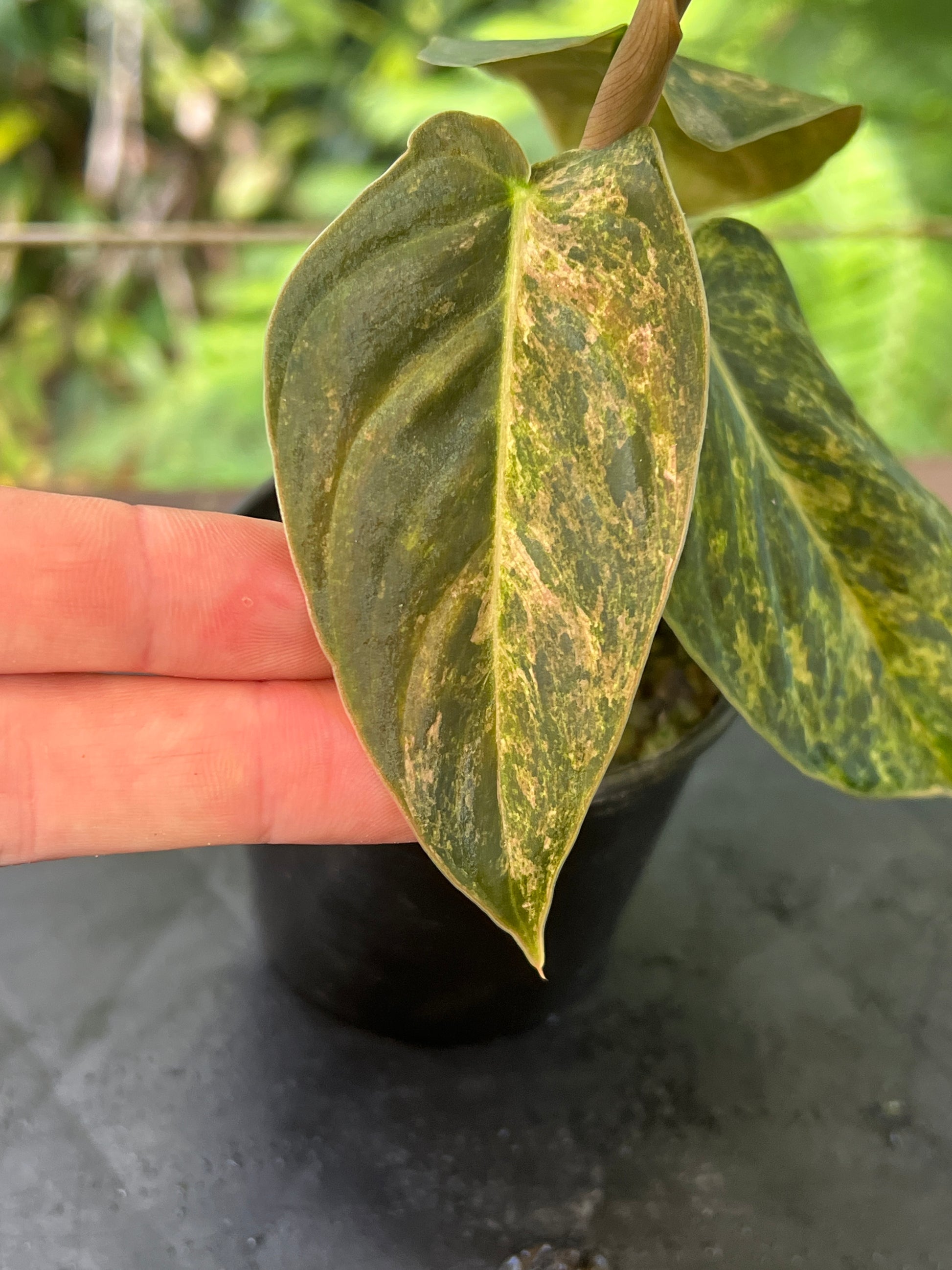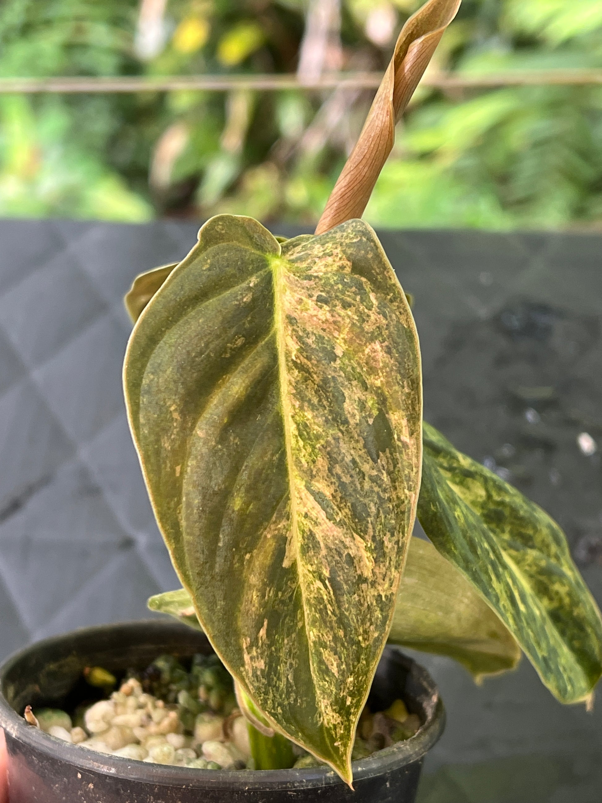 Philodendron melanochrysum x sharoniae this is a new hybrid, pollinated and grown from seed by us. This mottled variegation is looking interesting excited to see what it looks like on larger leaves!