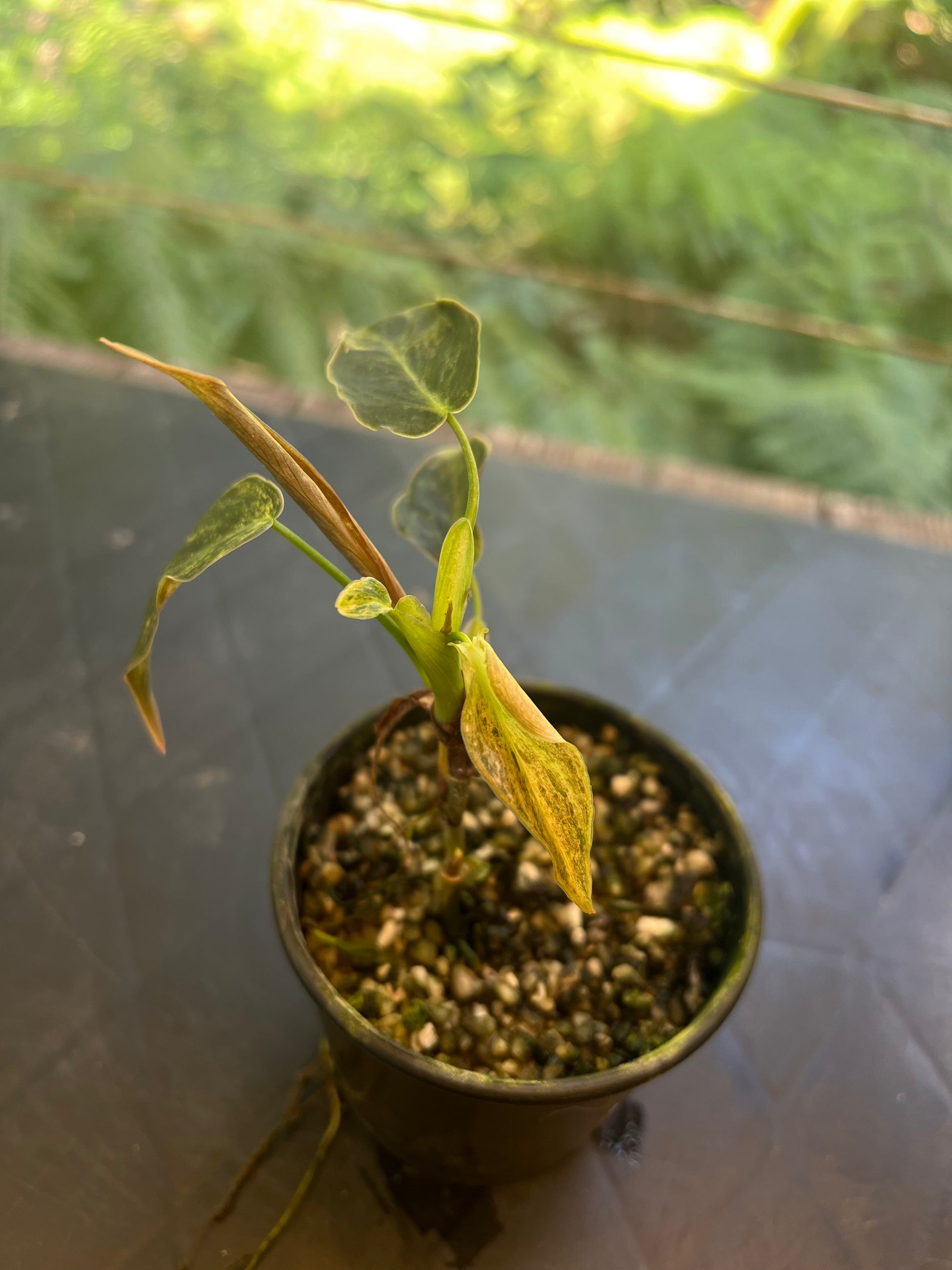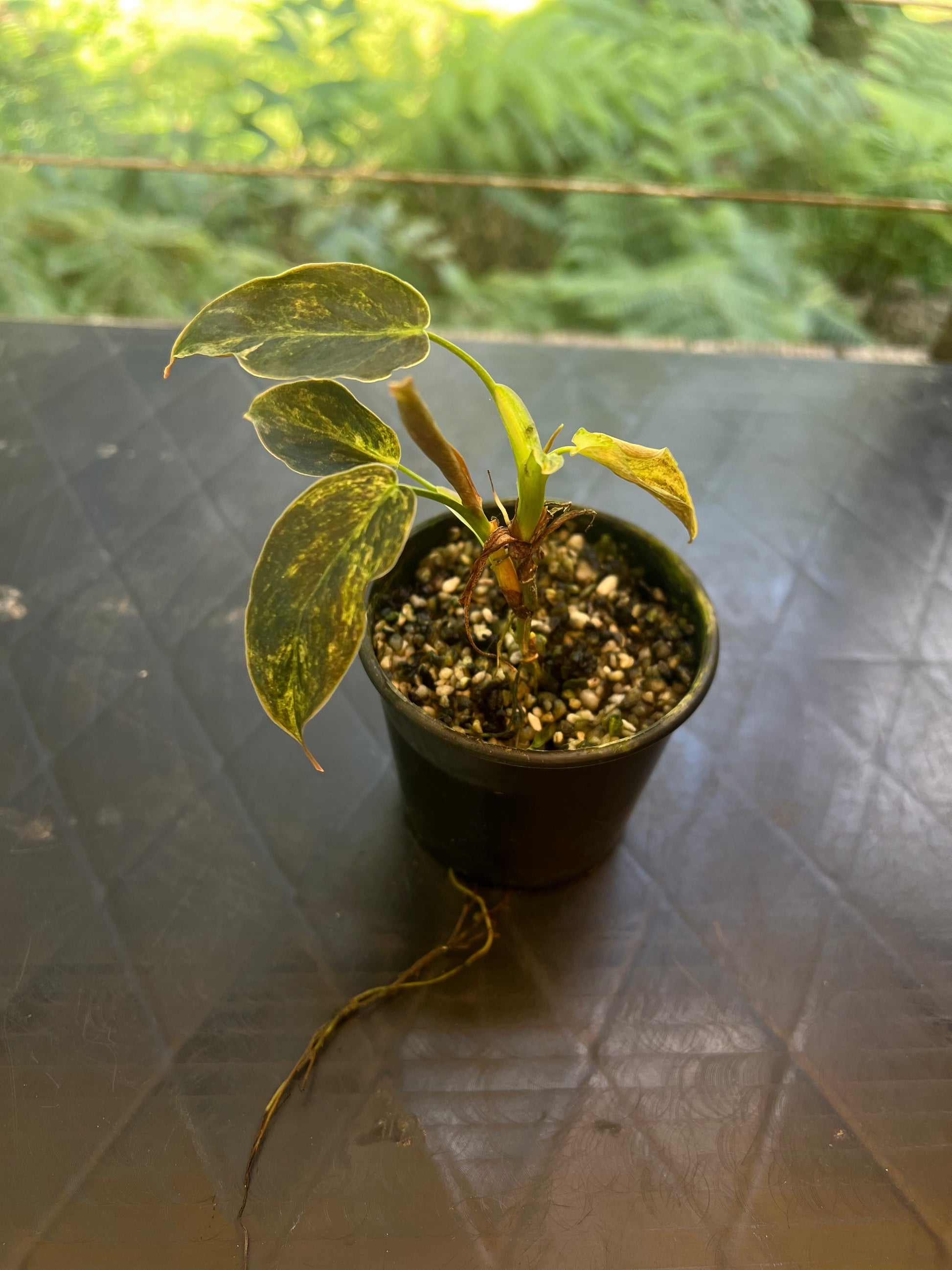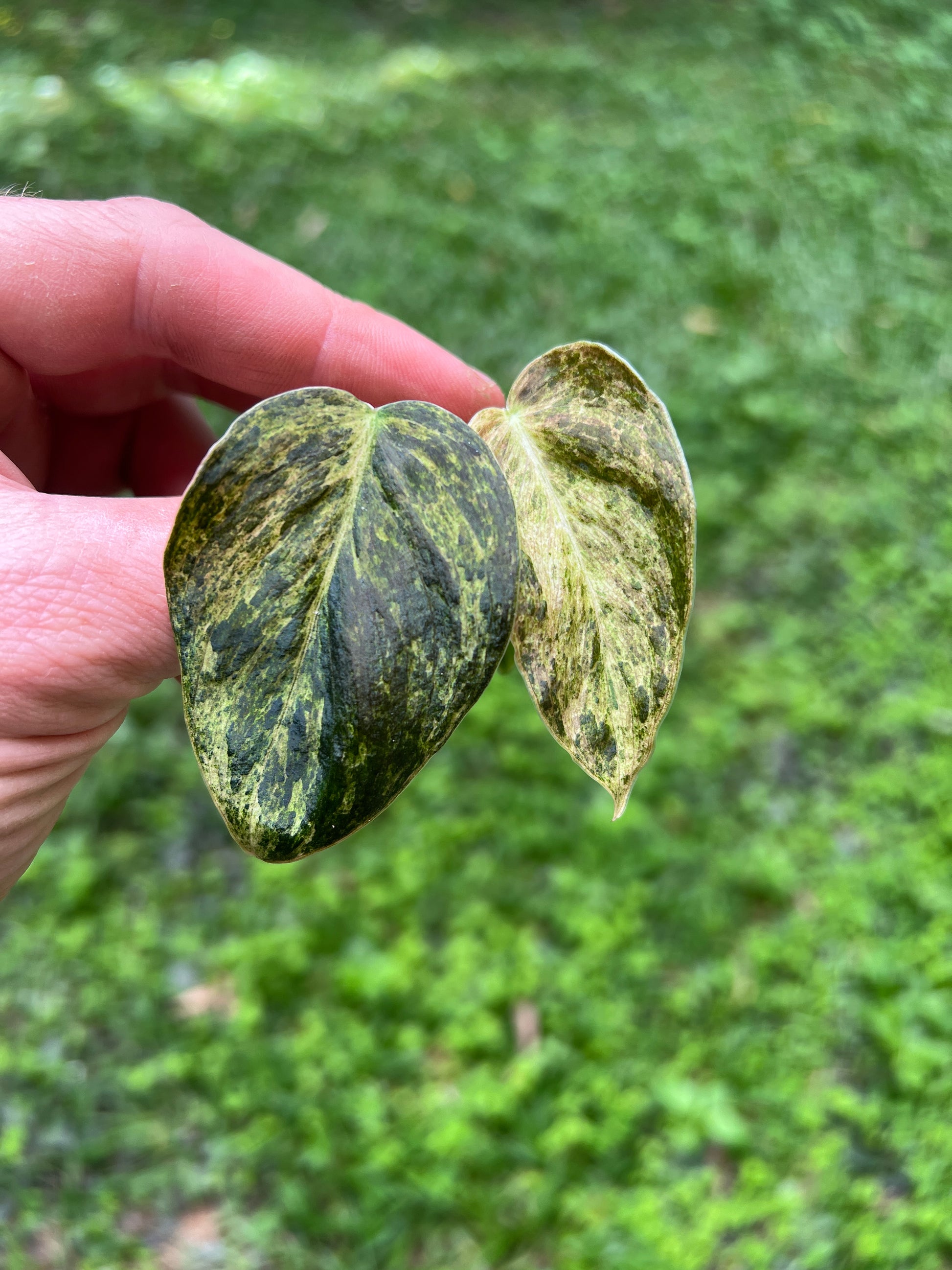 Philodendron melanochrysum x sharoniae this is a new hybrid, pollinated and grown from seed by us. This mottled variegation is looking interesting excited to see what it looks like on larger leaves! 1st photo an example of a sibling plant. The plant on offer has two heads.