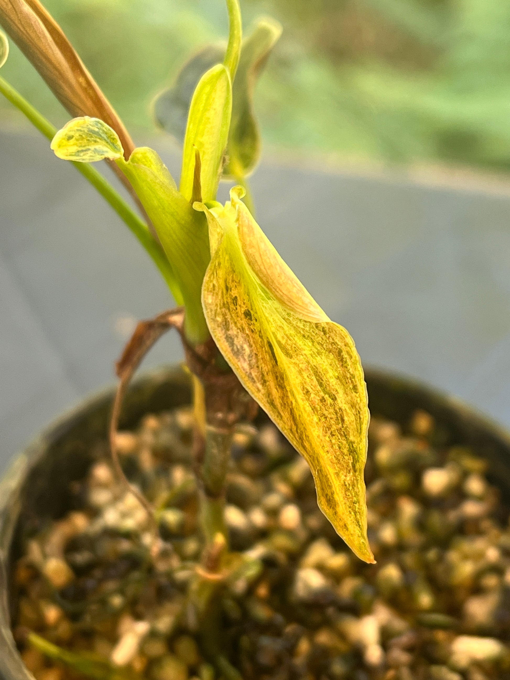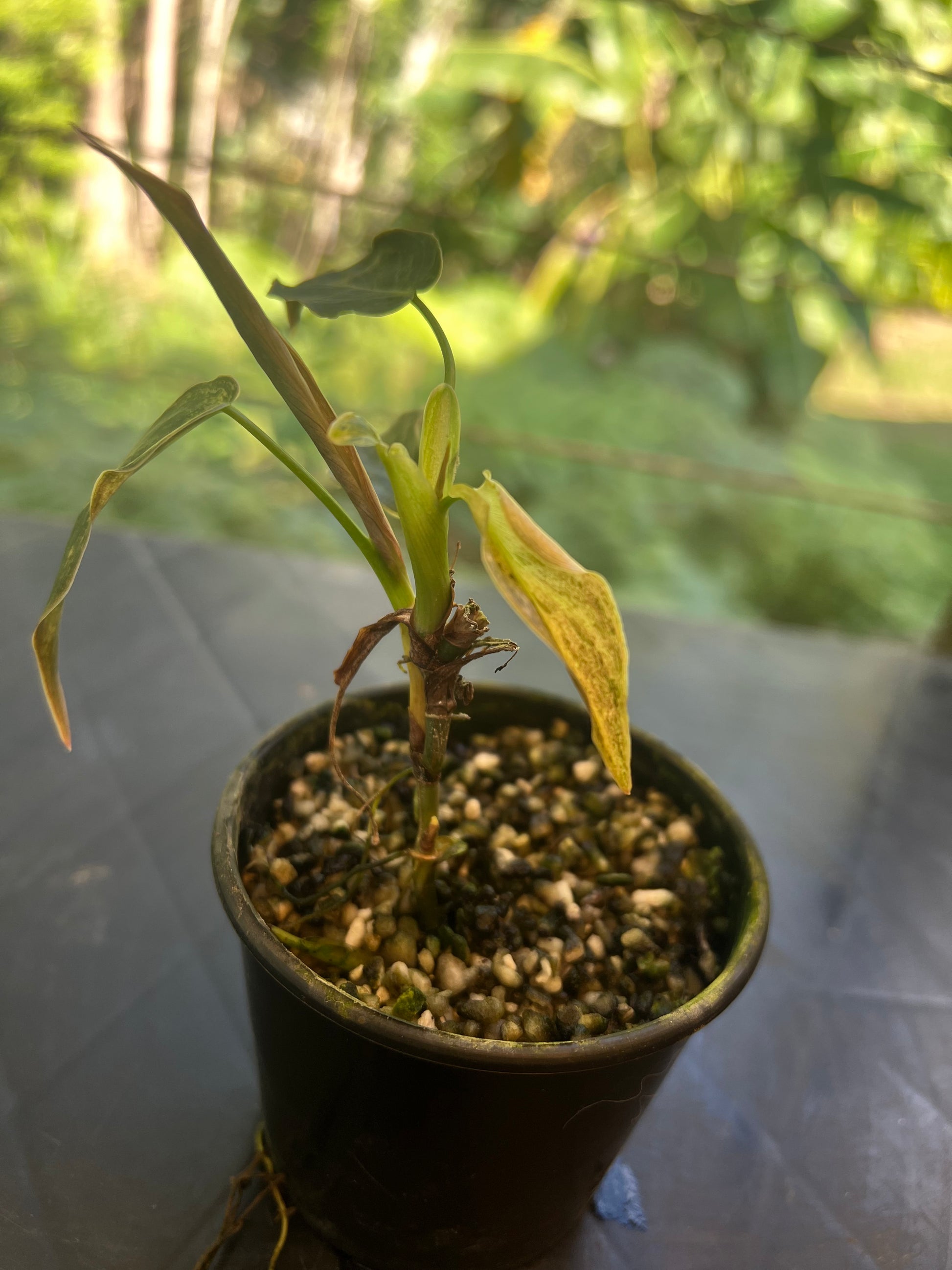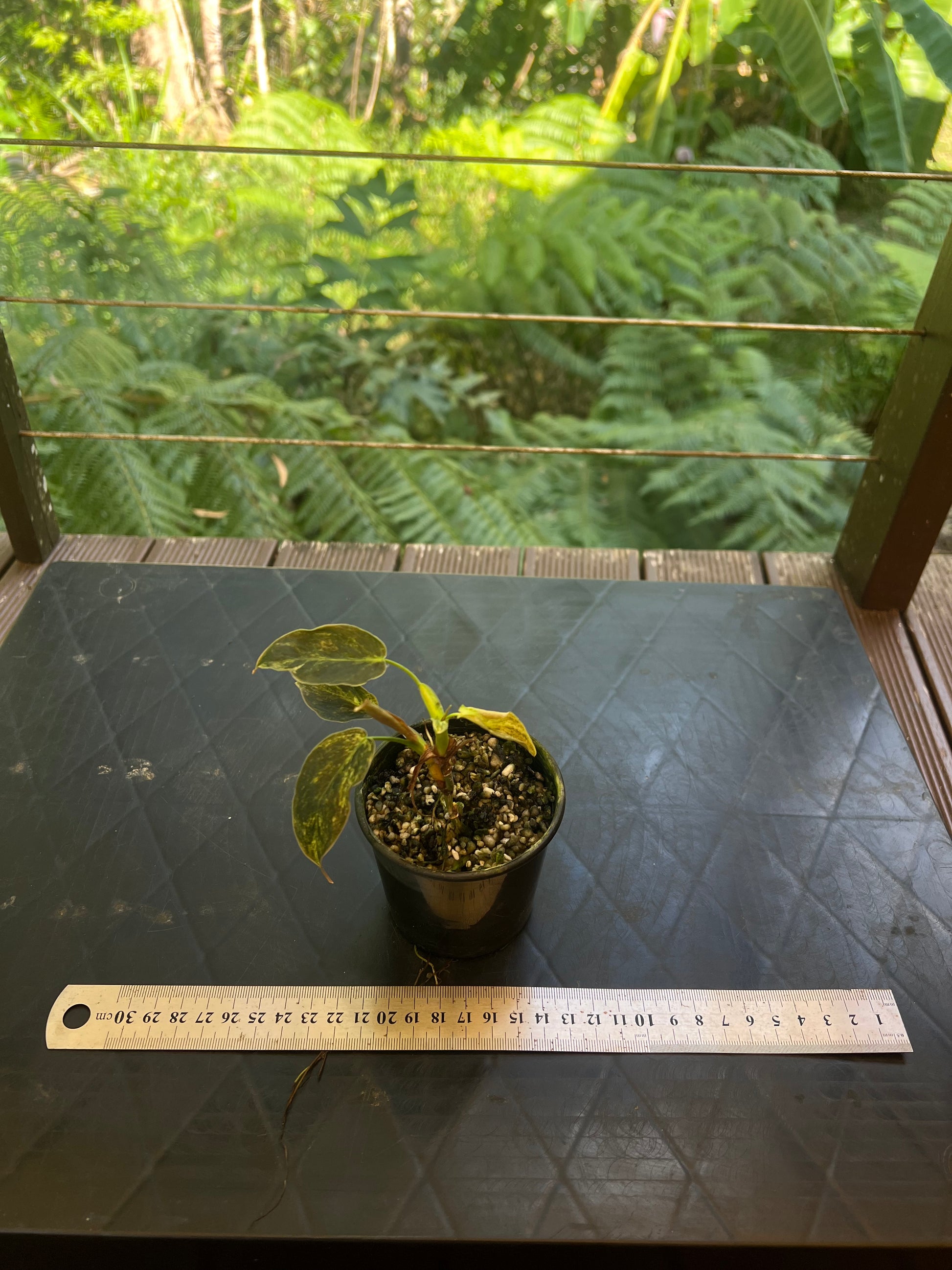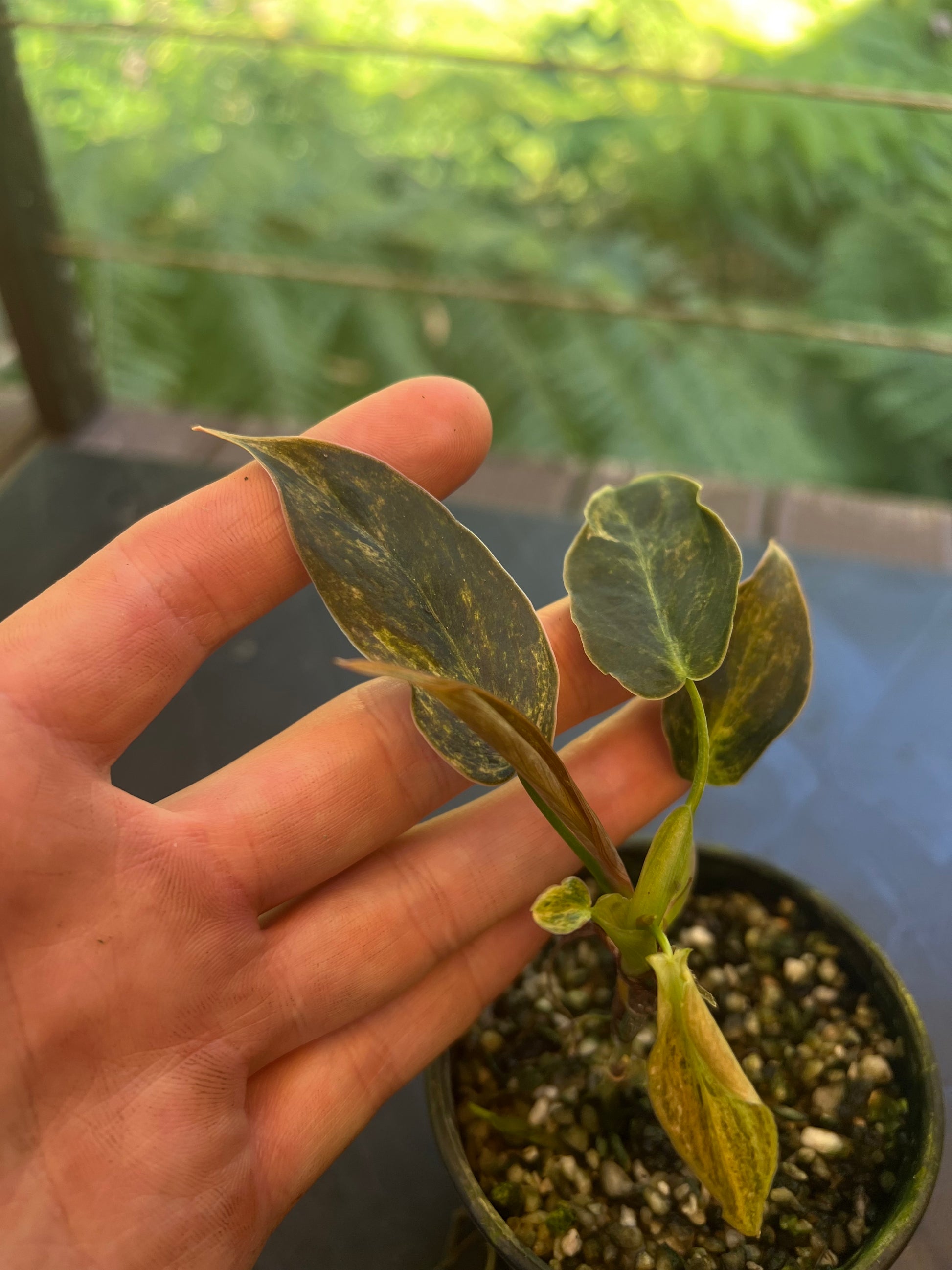 Philodendron melanochrysum x sharoniae this is a new hybrid, pollinated and grown from seed by us. This mottled variegation is looking interesting excited to see what it looks like on larger leaves! 1st photo an example of a sibling plant. The plant on offer has two heads.