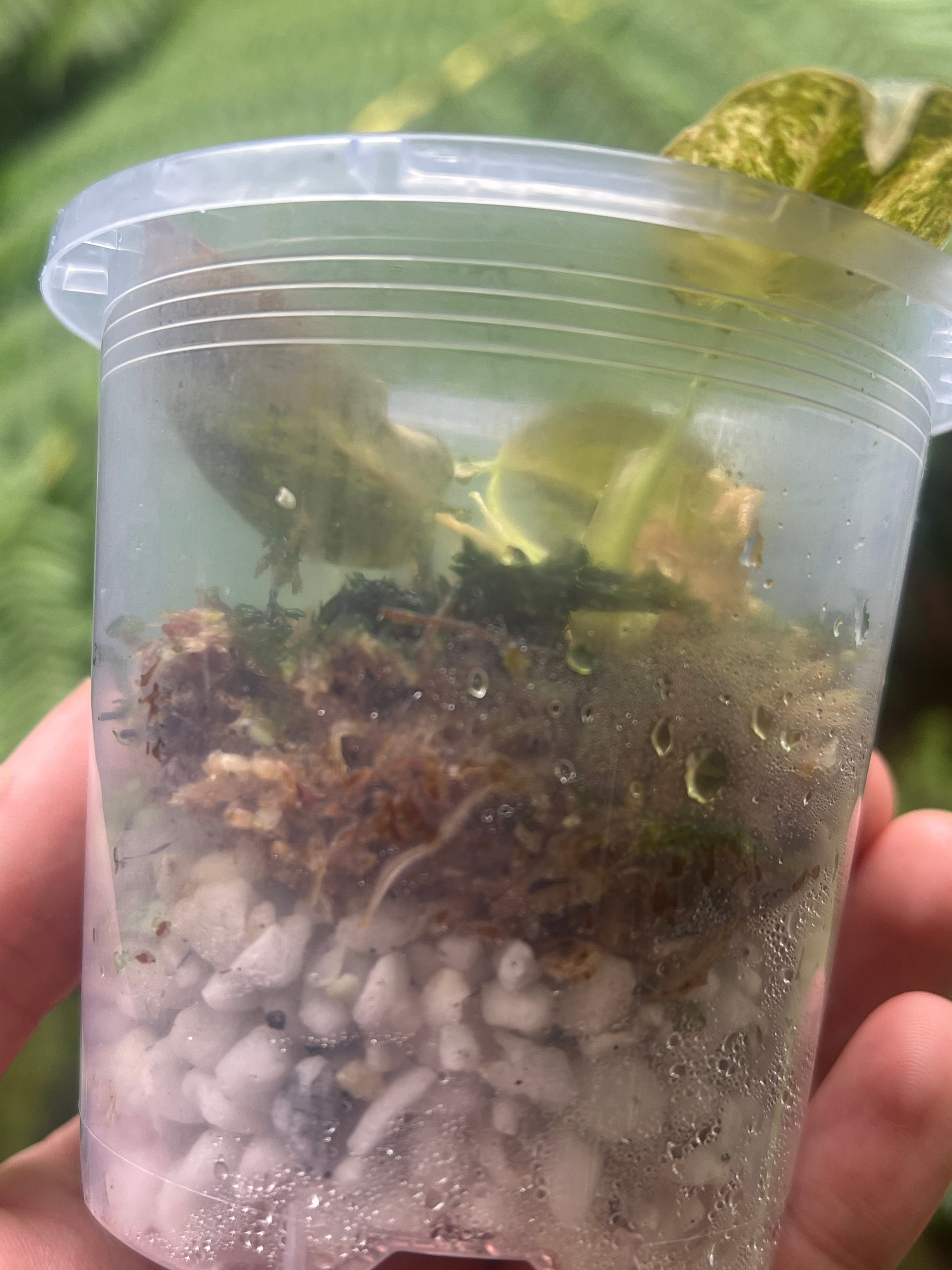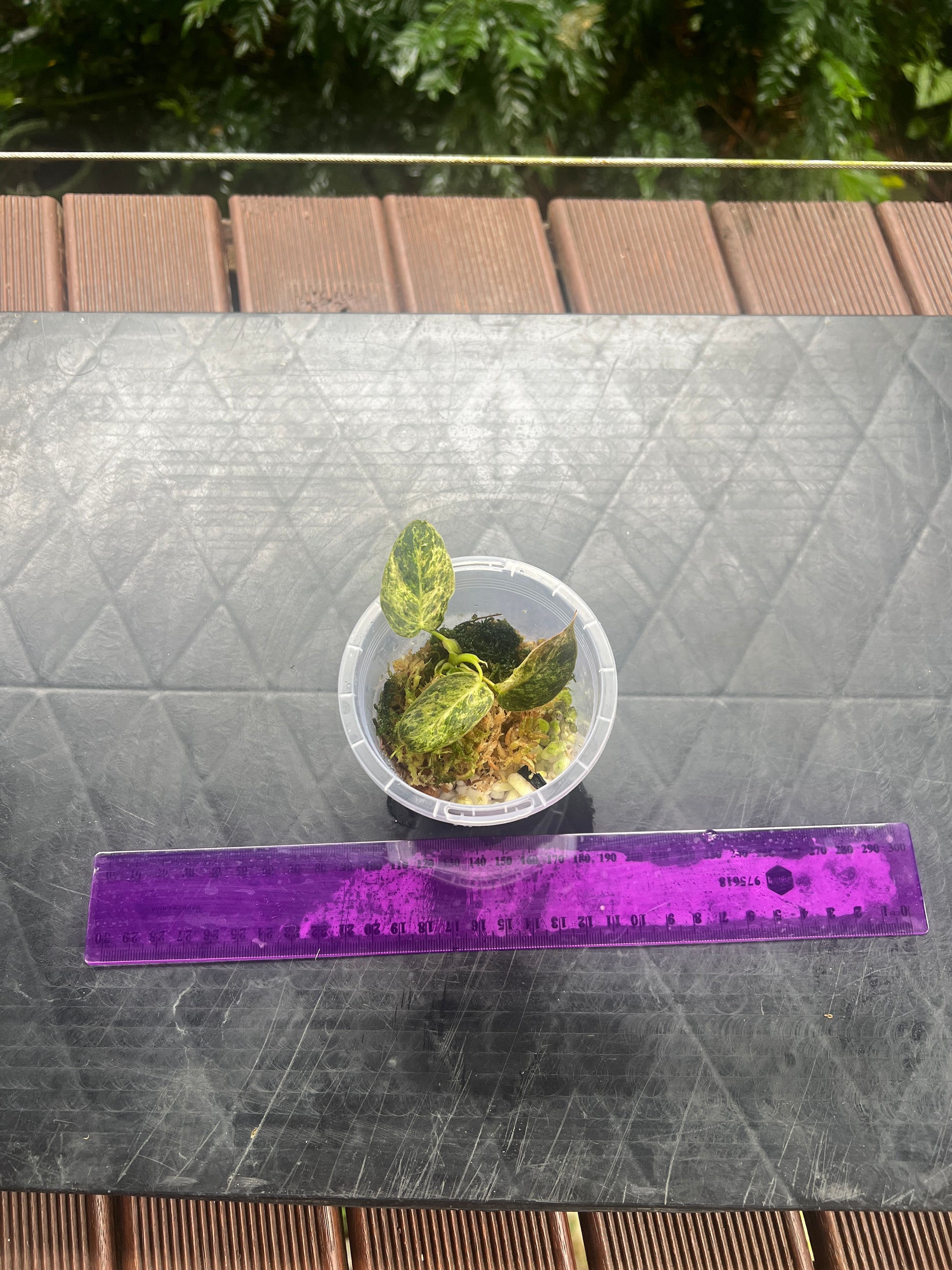 Philodendron melanochrysum x sharoniae this is a new hybrid, pollinated and grown from seed by us. This mottled variegation is looking interesting excited to see what it looks like on larger leaves!