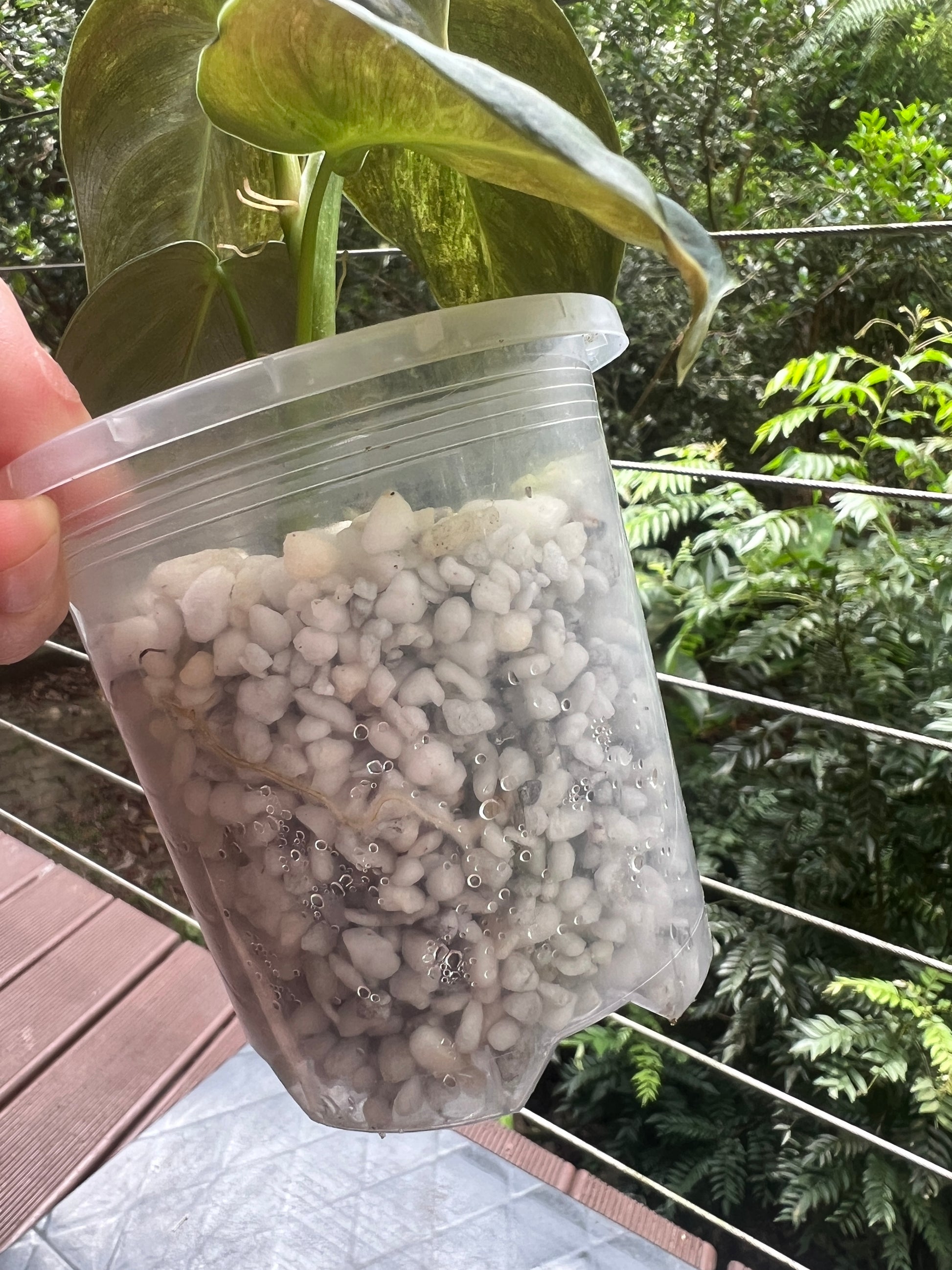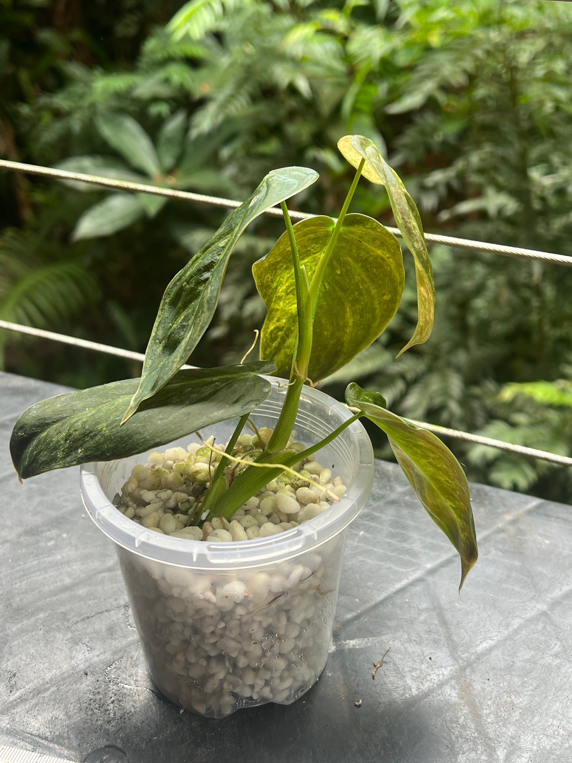 Philodendron melanochrysum x sharoniae this is a new hybrid, pollinated and grown from seed by us. This mottled variegation is looking interesting excited to see what it looks like on larger leaves!