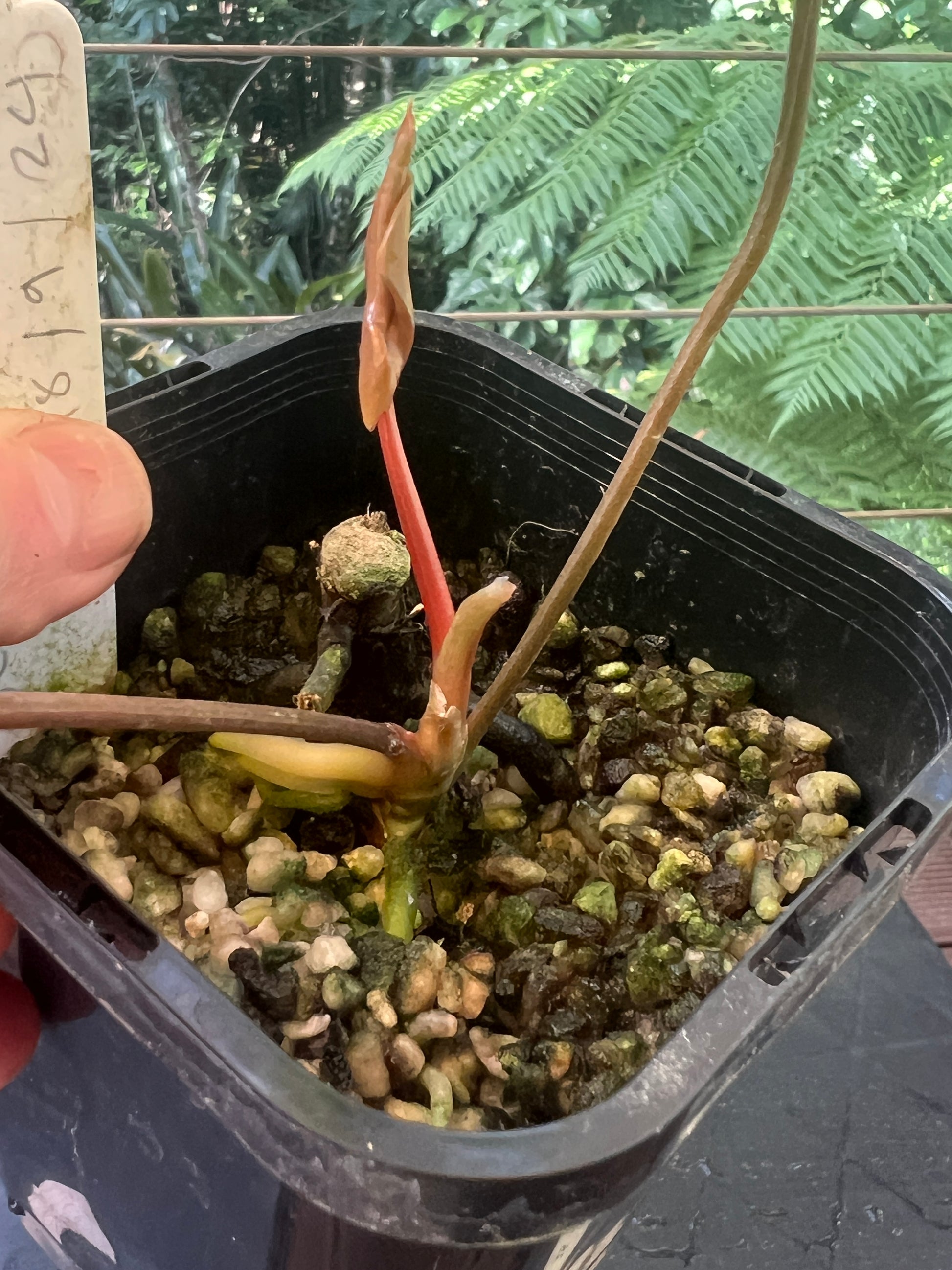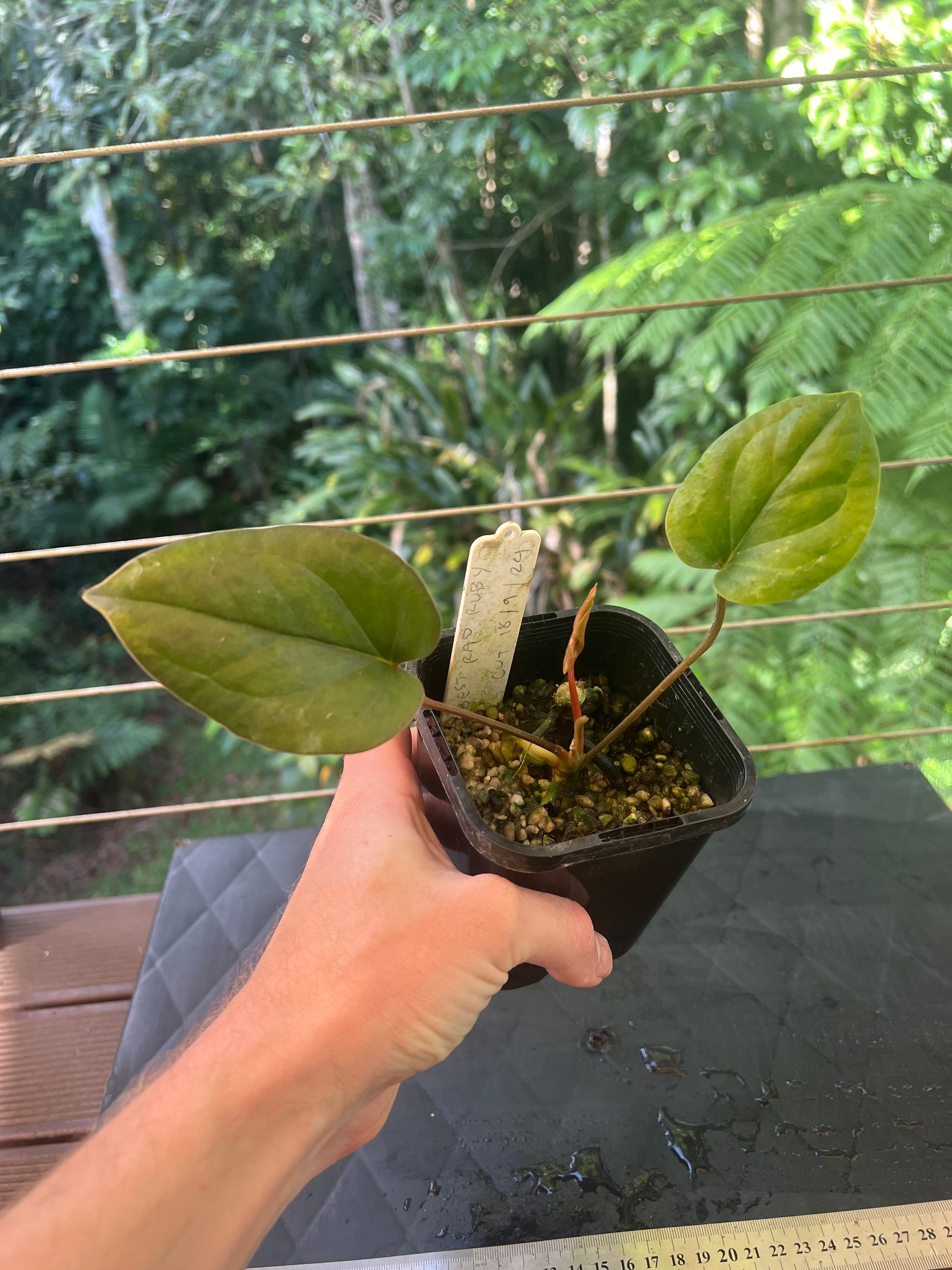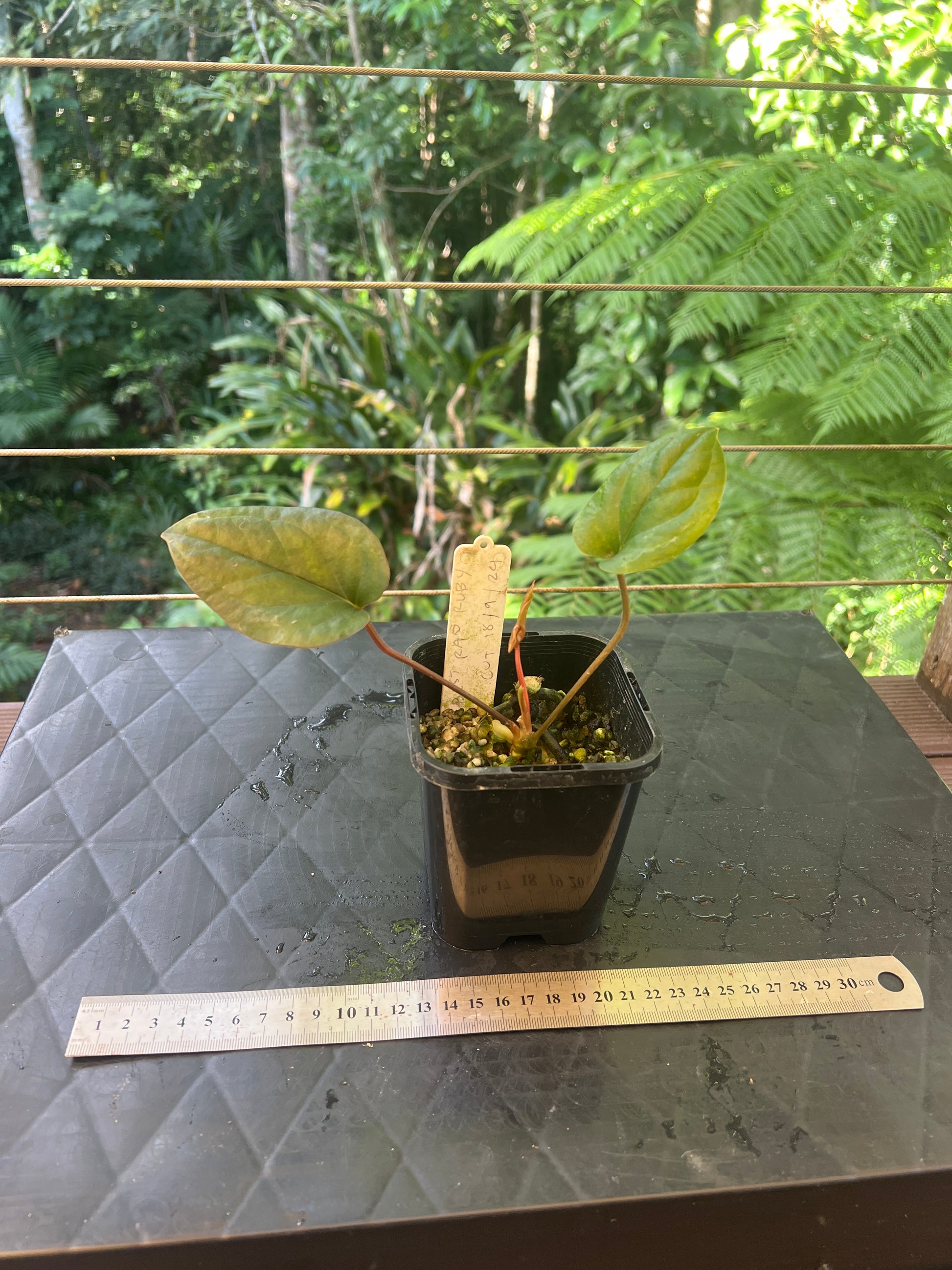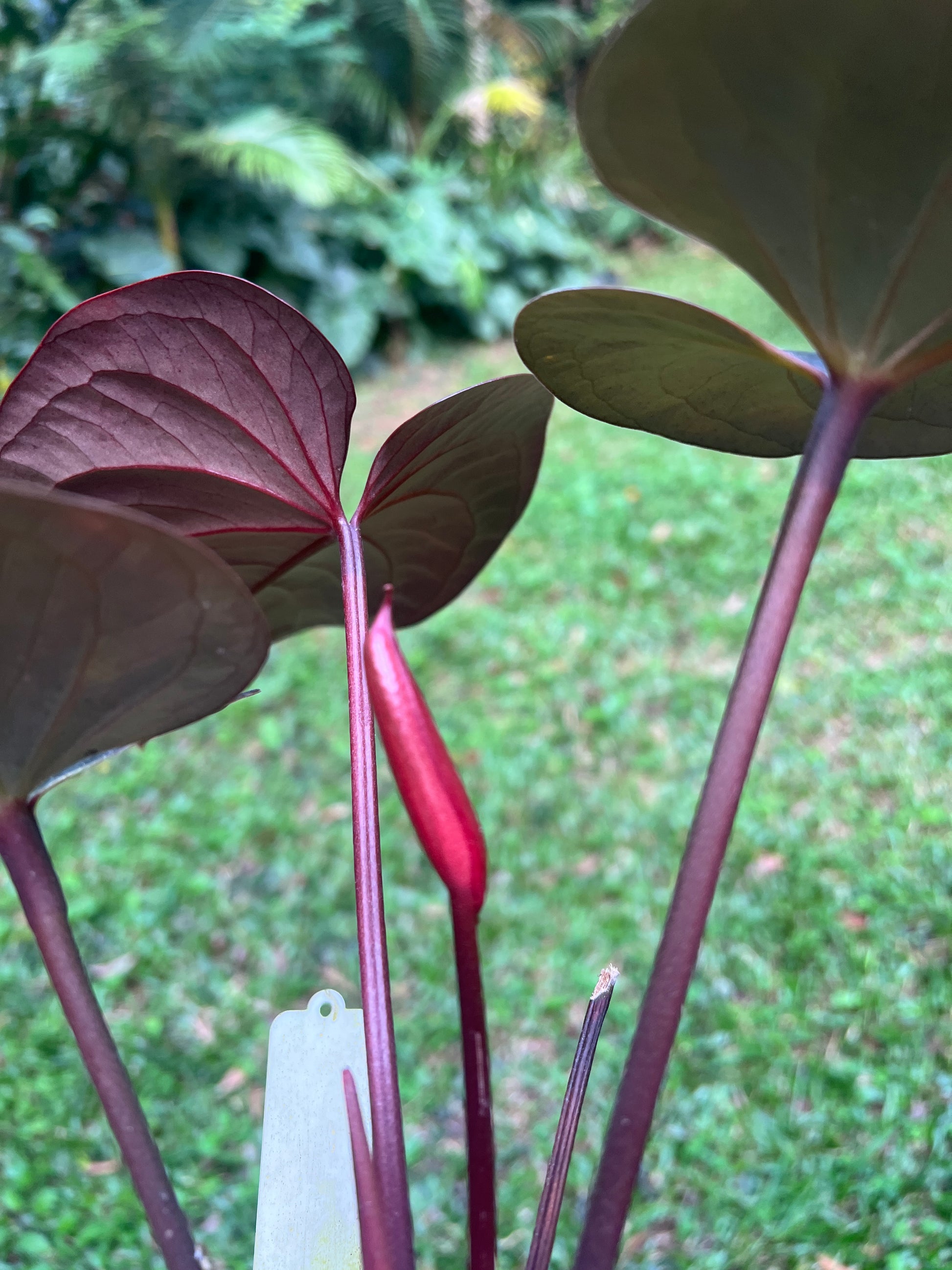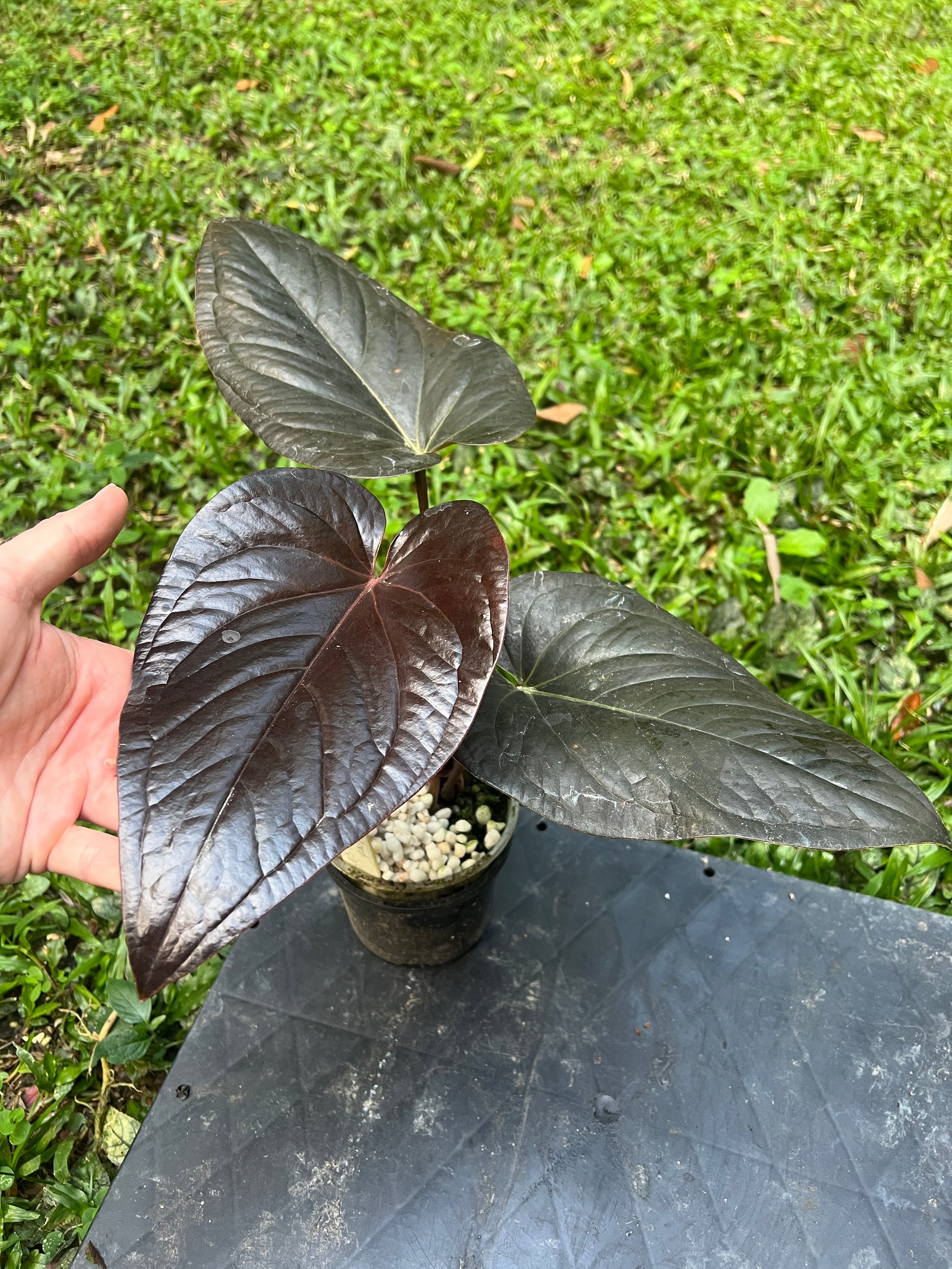 This is a cutting grown plant from our nicest darkest radican moody hybrid batch 'Rad Ruby'. When slightly larger the plant has really thick leathery black leaves and stays very compact. Very small grower, cute red spathe on small flower.